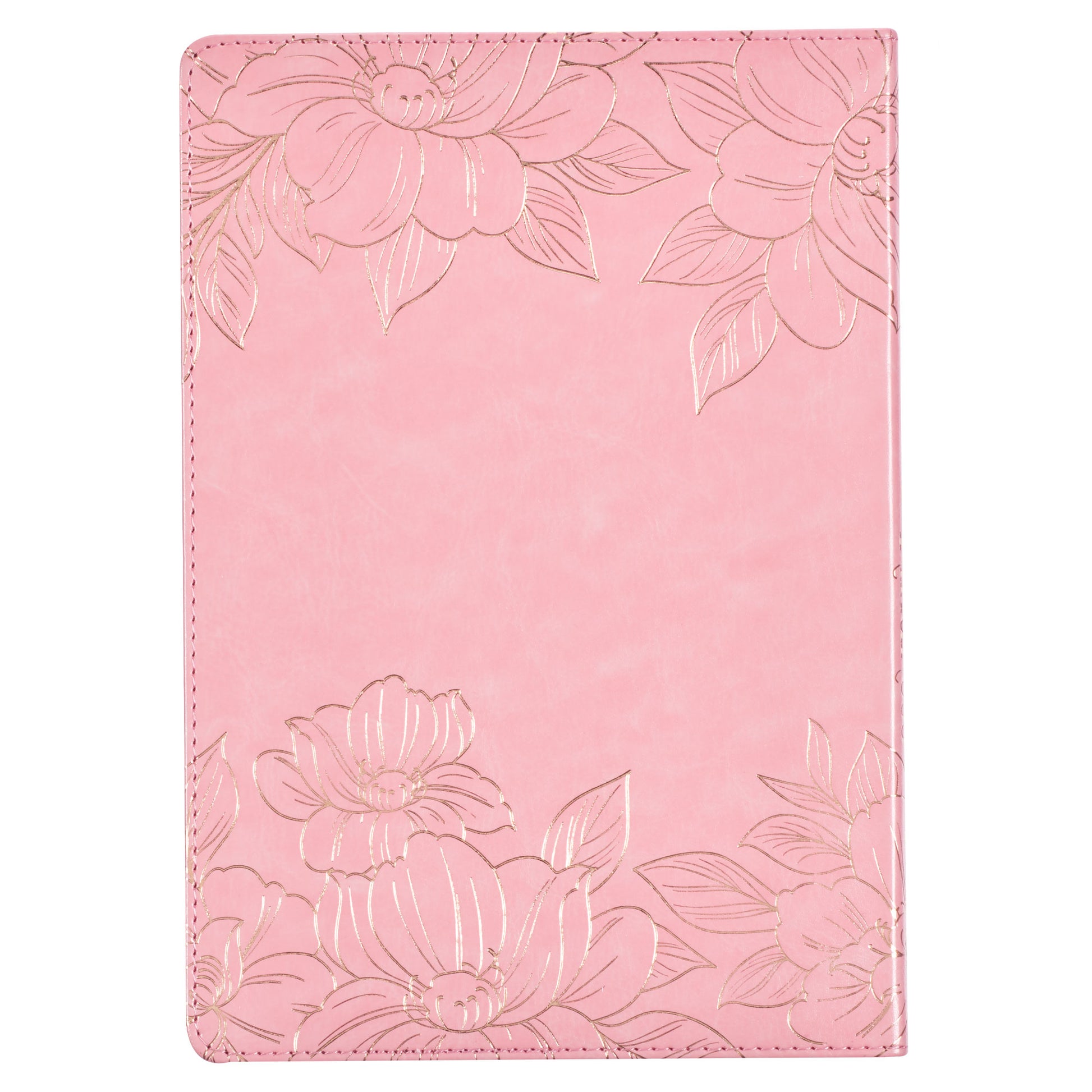 The pink faux leather devotional is heat-debossed with gold-filed floral outlines that frame the sentiment. The sentiment is printed in white, accented and outlined in gold foil.