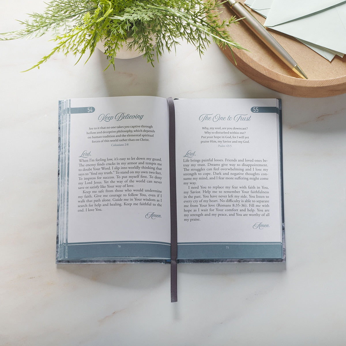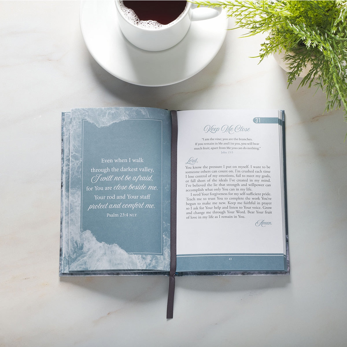 The hardcover cover book has a teal satin ribbon marker to mark your page. The interior pages are printed in one color and are decorated with a teal banner that runs along the bottom. Each of the 101 prayers features a title in a feminine script, a Scripture verse, and a prayer. Topics include Safe and Secure, Follow His Lead, and much more. Interspersed among the prayers, you will find encouraging Scripture printed on pages with a teal stormy sea design.