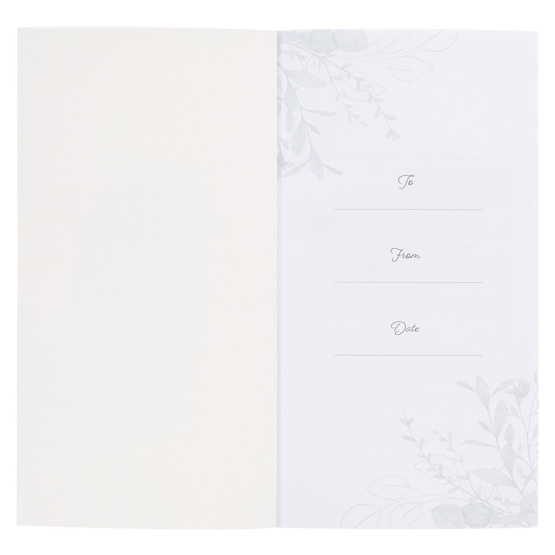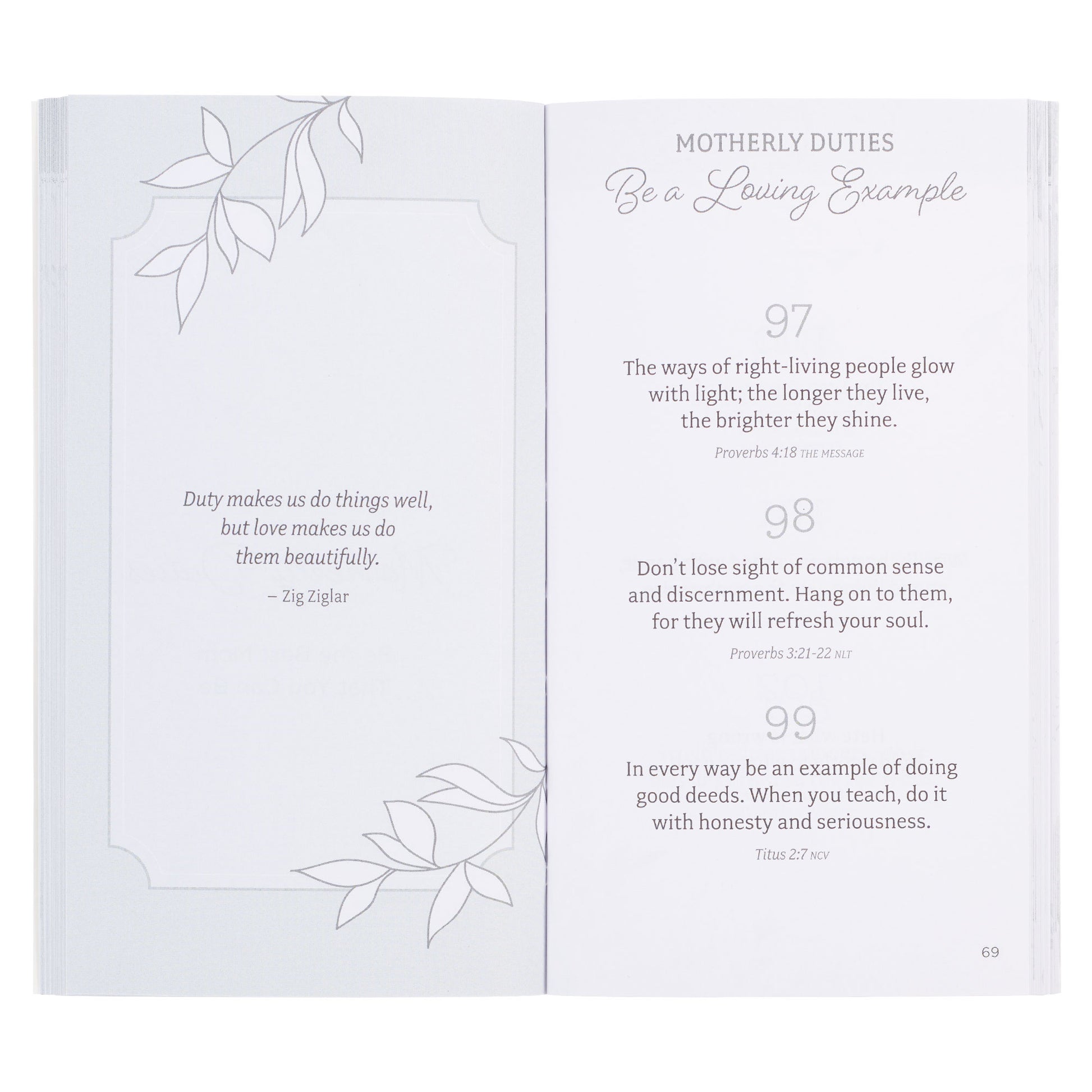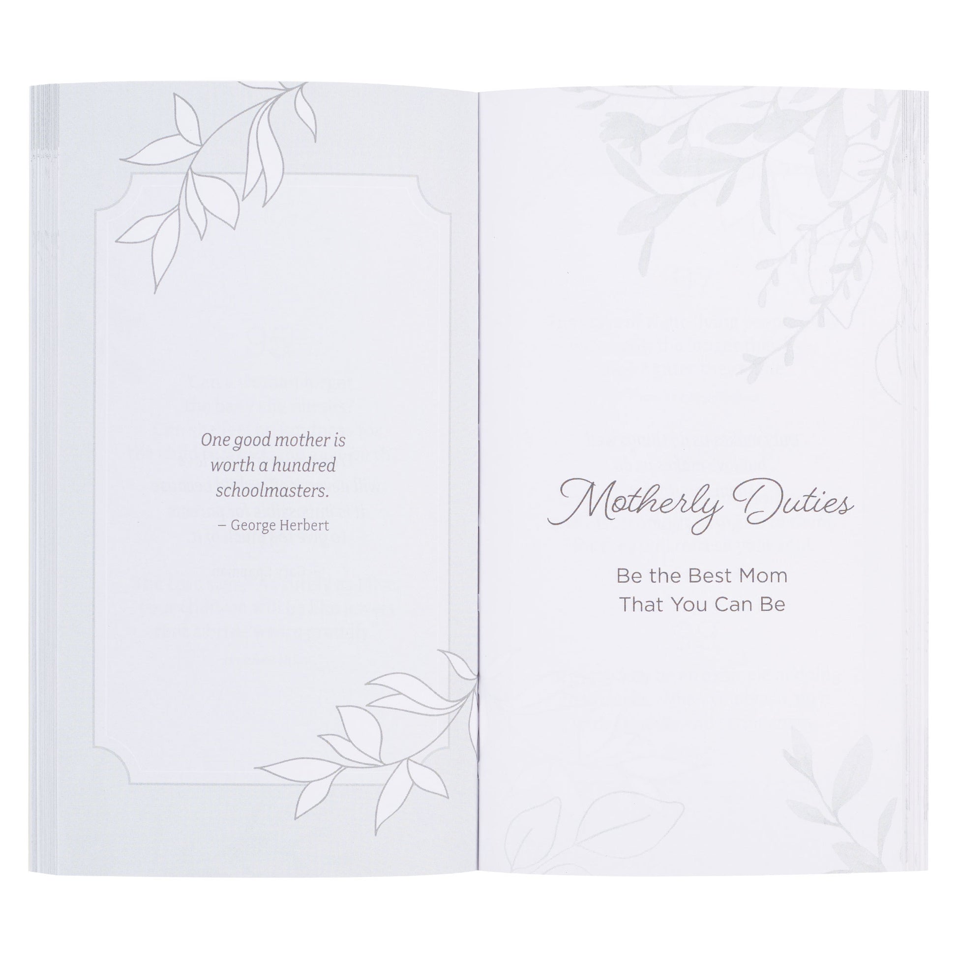 The presentation page is accented with one-color printed floral corner decorations and lined space, allowing you to personalize it when giving it as a gift. The booklet is organized thematically around eight main topics every mother can relate to. These topics include starting your day with Scripture, getting through challenging days, finding joy in motherhood, understanding the role of a mother, striving to be the best mom you can be, coping with stress, matters of the heart, and building a strong family unit. Each category is further divided into subcategories that feature supporting Scripture verses and quotes from classic Christian authors.