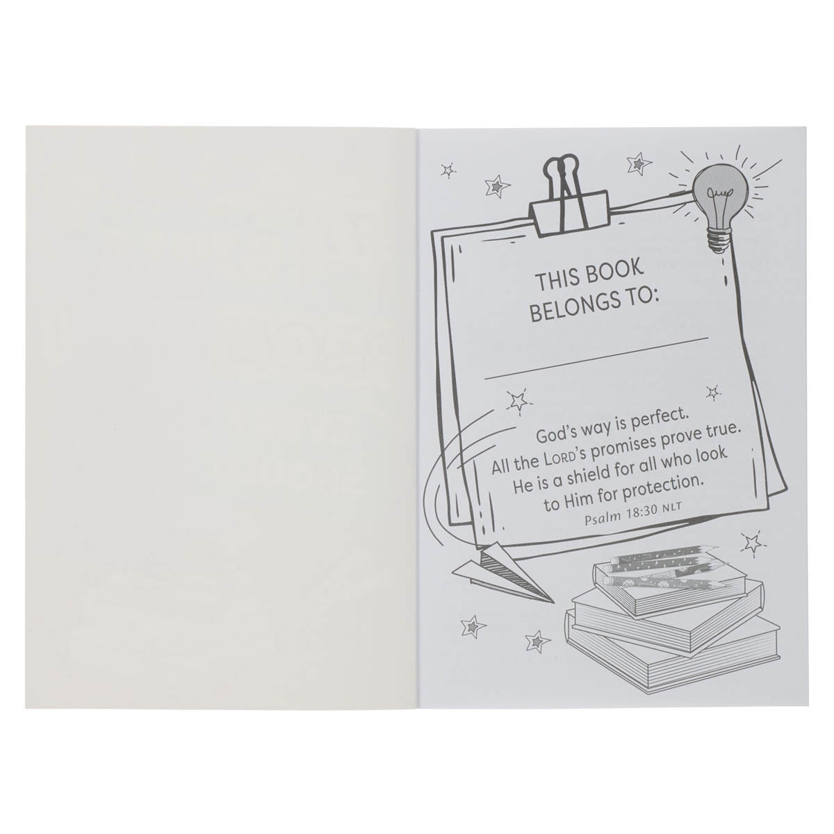 The interior of the book is printed in black. Each verse is printed at the top of the page, followed by a space to copy it. Lastly, children are invited to color an artistically rendered image of the same verse. In the back of the book, you will find a list of all 77 Bible promises, so you can add a checkmark once it's memorized.