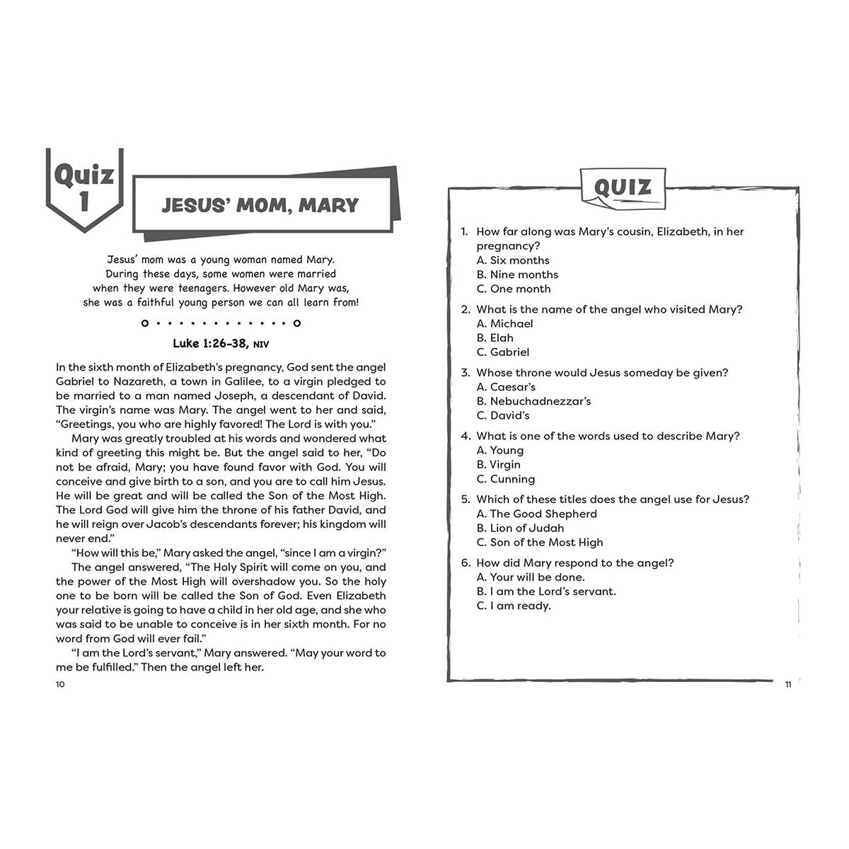 The interior pages are white with black printed text. There are 77 Bible stories that each feature a short quiz. Stories start with the birth of Jesus and take kids on a journey through His life, the missionary journeys of Paul, and the growth of the church. The quizzes add a fun challenge and help kids remember these important stories about God's plan to save the world.