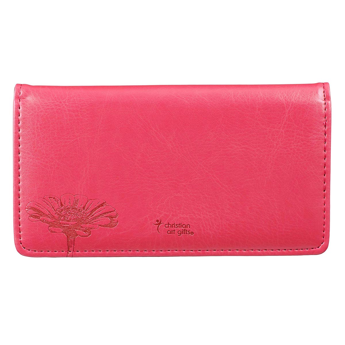 Anyone will treasure this Inspirational Checkbook Cover constructed of quality man-made material imported from Italy, with the look and feel of real leather (trade name LuxLeather). Adorned with a contrast top-stitched zinnia and Scripture from Matthew 19:26 debossed into the cover, the checkbook wallet offers the functionality of a billfold. With an inside slip pocket, 3 credit card slots, an ID card window, plastic divider for duplicate checks and a pen loop, this accessory holds all that you need for banking, paying and record keeping.