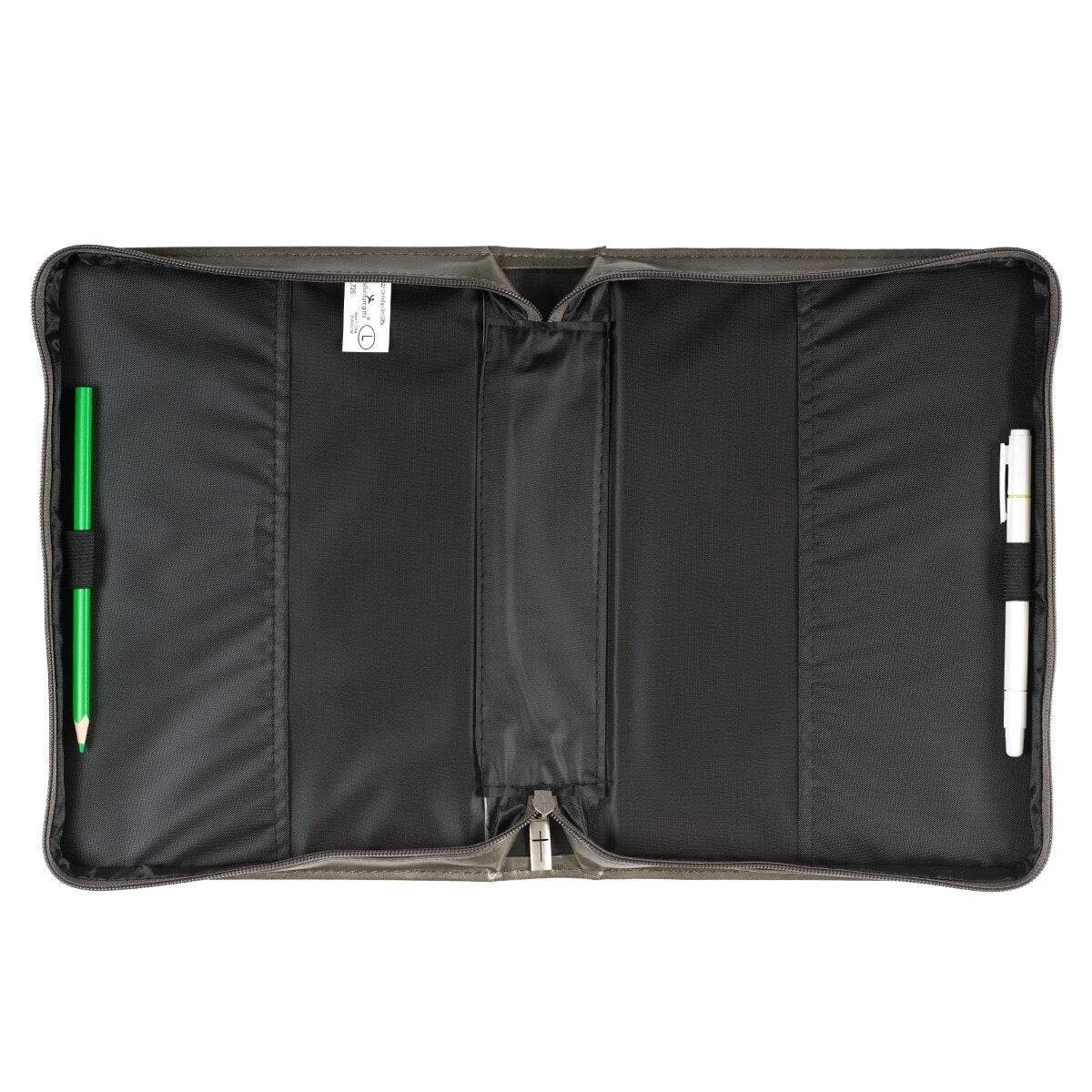 Silver metal hardware attaches a lay-flat carry handle that allows the Bible cover to open completely flat. The gray zipper closure closes with a silver metal cross-engraved zipper pull. Inside the case, you will find two pen loops to accommodate pens or highlighters.