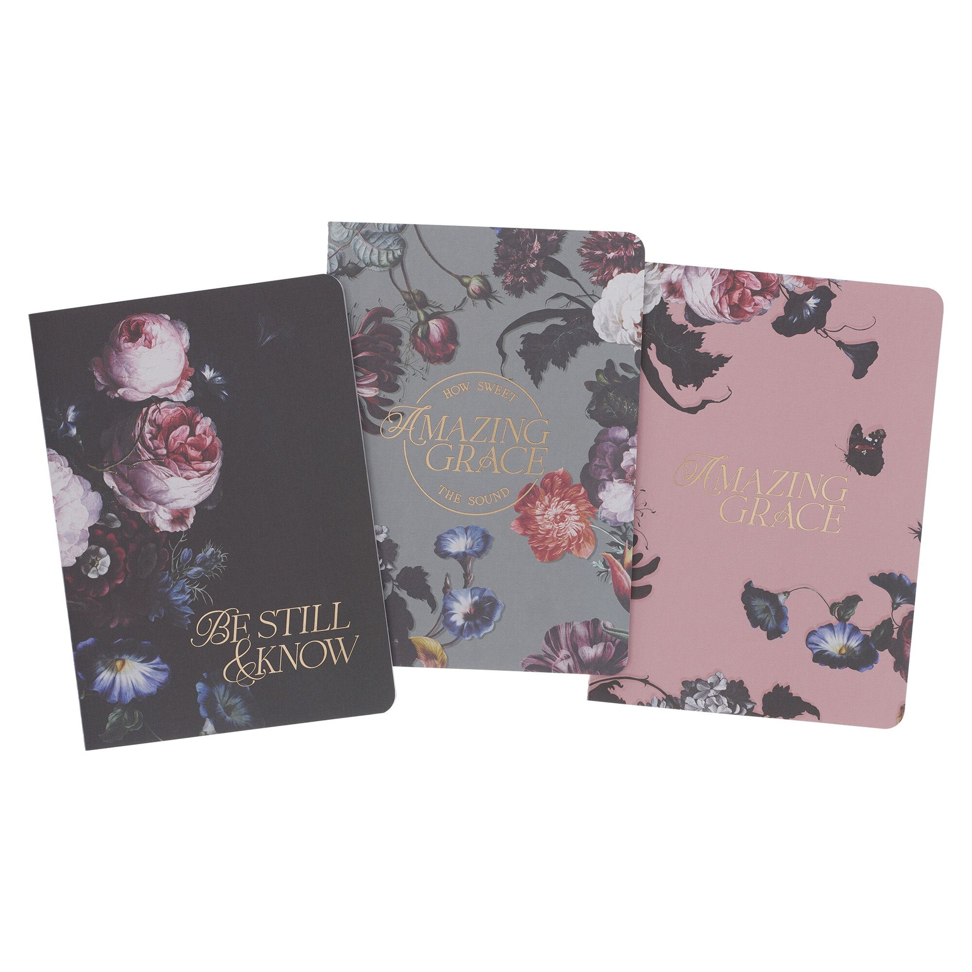 Each of the three notebooks boasts a distinct composition, yet they share a common color scheme and design elements. The encouraging theme of the set centers around the amazing grace that God extends to us and the peace we feel when we trust that He is who He says He is.