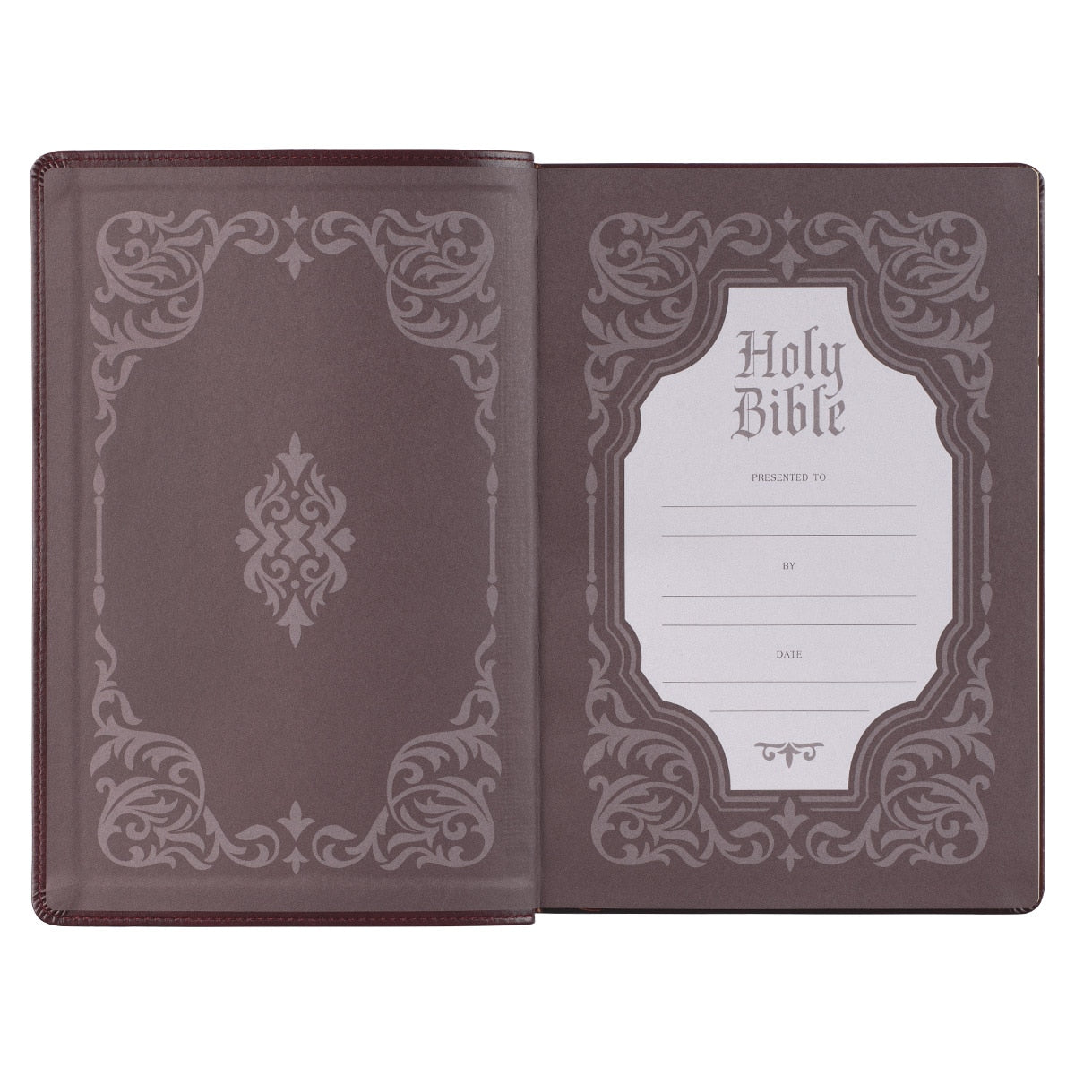 The rich brown cover of the Antiqued Dark Brown Faux Leather Giant Print Full-size King James Version Bible with Thumb Index is reminiscent of an antique leather-bound Bible, complete with elevated spine ribbing and gold foil. While the outside may look antique, the inside is full of modern-day upgrades that complement the original 1769 text—including an easy-to-read 14-point type font.