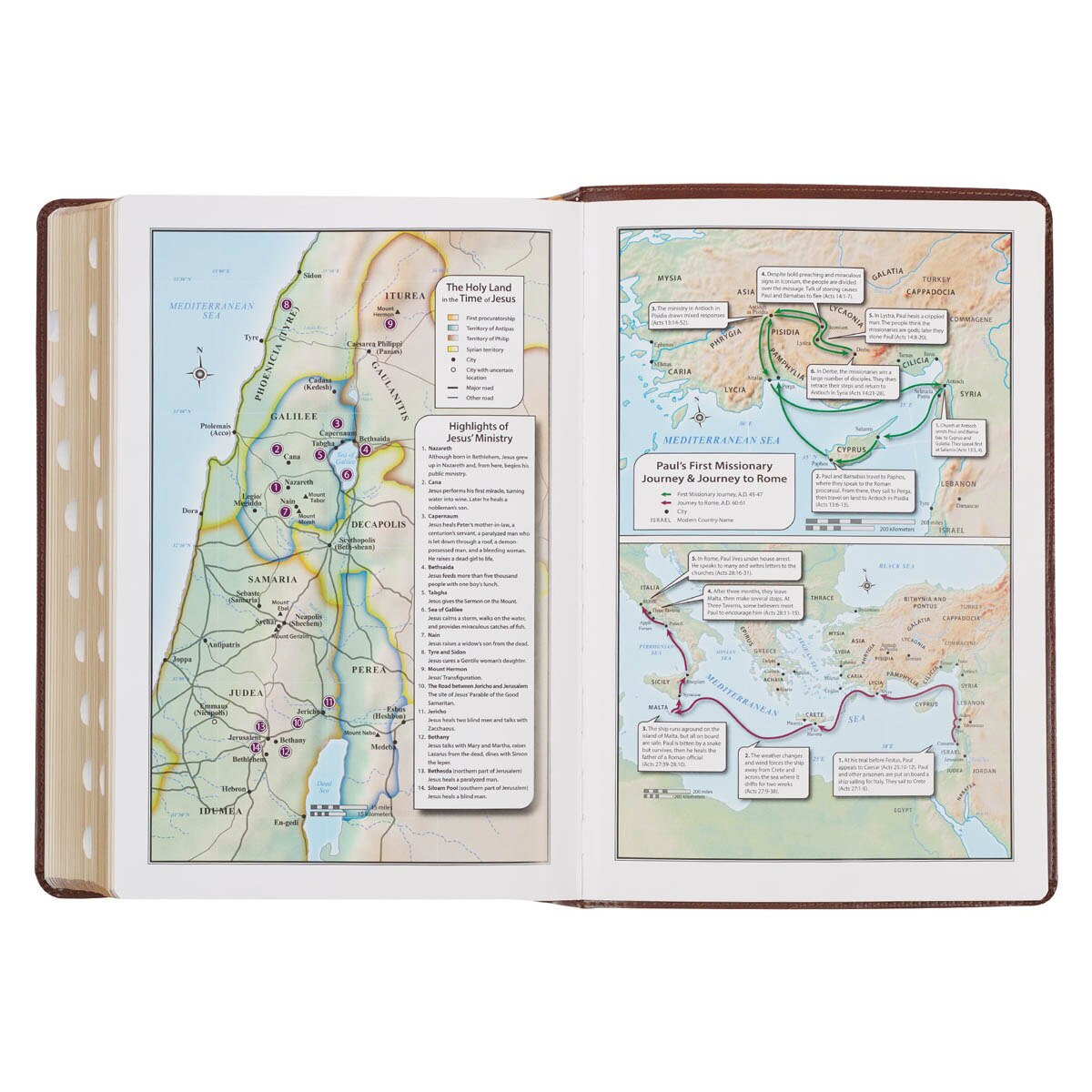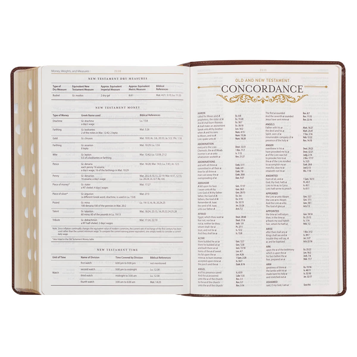 Designed for durability and convenience, this Bible features a lay-flat spine, allowing for easy reading and study. Two satin ribbon markers are provided, enabling you to mark multiple pages of significance at the same time. Navigating through the Bible is made effortless with the thumb index. The interior pages are printed in black ink and adorned with metallic gold decorative accents. The text is presented in a double-column format, utilizing an 11-point type for comfortable reading.