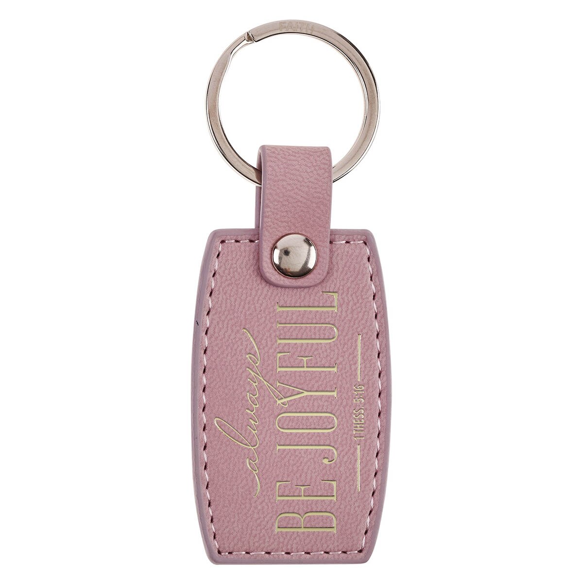 The Always Be Joyful Dusty Mauve Faux Leather Keychain is part of the Joyful Dusty Mauve Collection, this keychain coordinates beautifully with matching pieces designed to spark joy and gratitude in your day—a mini magnetic calendar, small daily planner, scented candle in a glass jar, checkbook wallet, ceramic mug, spiral journal, faux leather Bible cover, classic journal, tote bag, stainless steel water bottle, and gift bag.