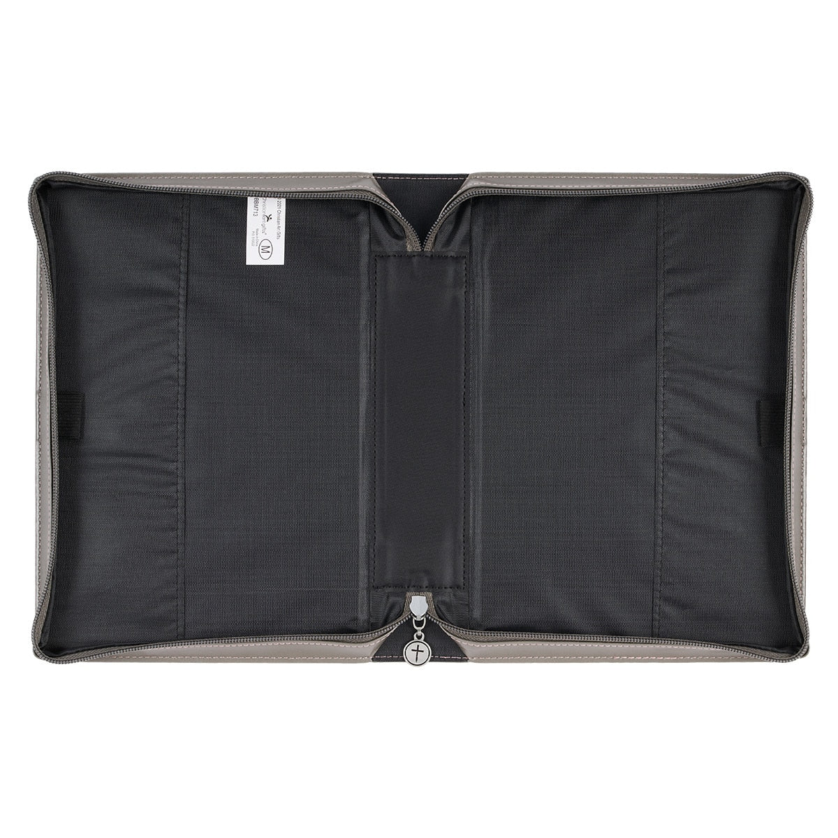 The gray back panel has a slip pocket that can be used to keep loose papers, church bulletins, or even a notebook. A lay-flat spine handle is constructed from the same durable gray faux leather as the cover and allows the Bible case to open completely flat so that you can open your Bible completely flat. Topstitching along all the side seams and pocket seams ensure that this Bible cover stays in top condition. The durable faux leather can easily be cleaned with a damp cloth. The brushed silver zipper pull complements the classic design. Inside you will find two pen loops to secure your pens or highlighters when not in use. This Bible cover is available in three sizes: medium, large, and extra-large. Please refer to the last image in the image carousel on the left for the Bible Cover Sizing Chart before you make a selection.The classically feminine design makes the Be Still And Know Faux Leather Bible Cover an excellent gift for a young lady who likes to protect her Bible. It is also appropriate for a mature woman who has a sentimental attachment to the years of notes she has made in her Bible. Bless a woman in your life when you give the Be Still And Know Faux Leather Bible Cover as a birthday gift to your favorite aunt or grandmother.- Classic carte postal design