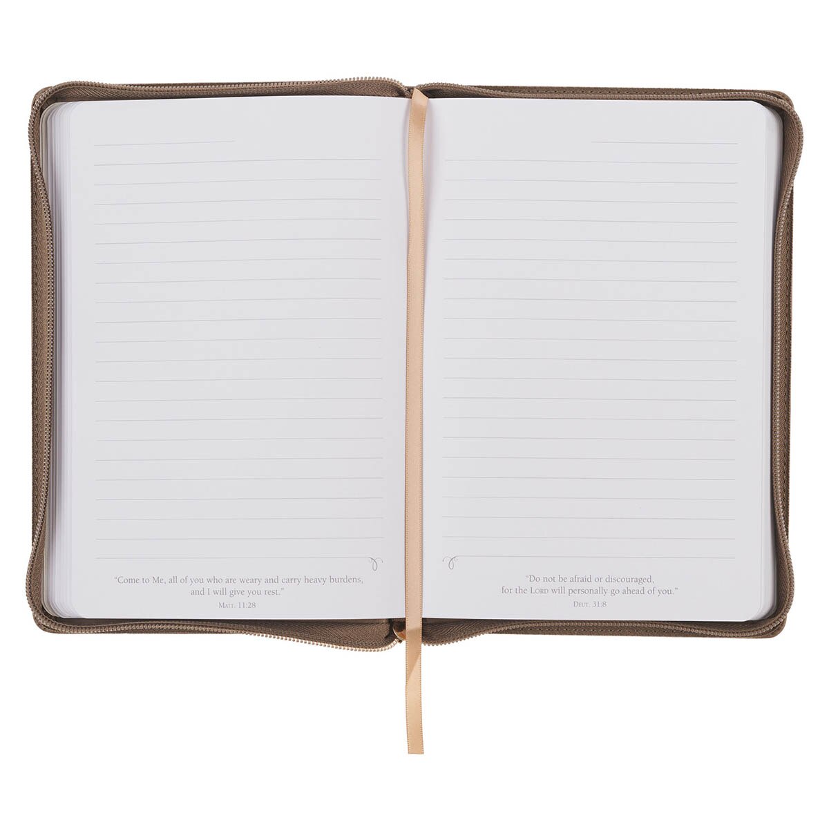 The Be Strong and Courageous Ash-brown Faux Leather Journal with Zipper Closure is a safe place to explore how God's strength sustains you through life's journey. Whether you are embarking on a new season, chasing a dream, or facing uncertain times, this beautiful journal invites you to lean into God's presence with confidence.