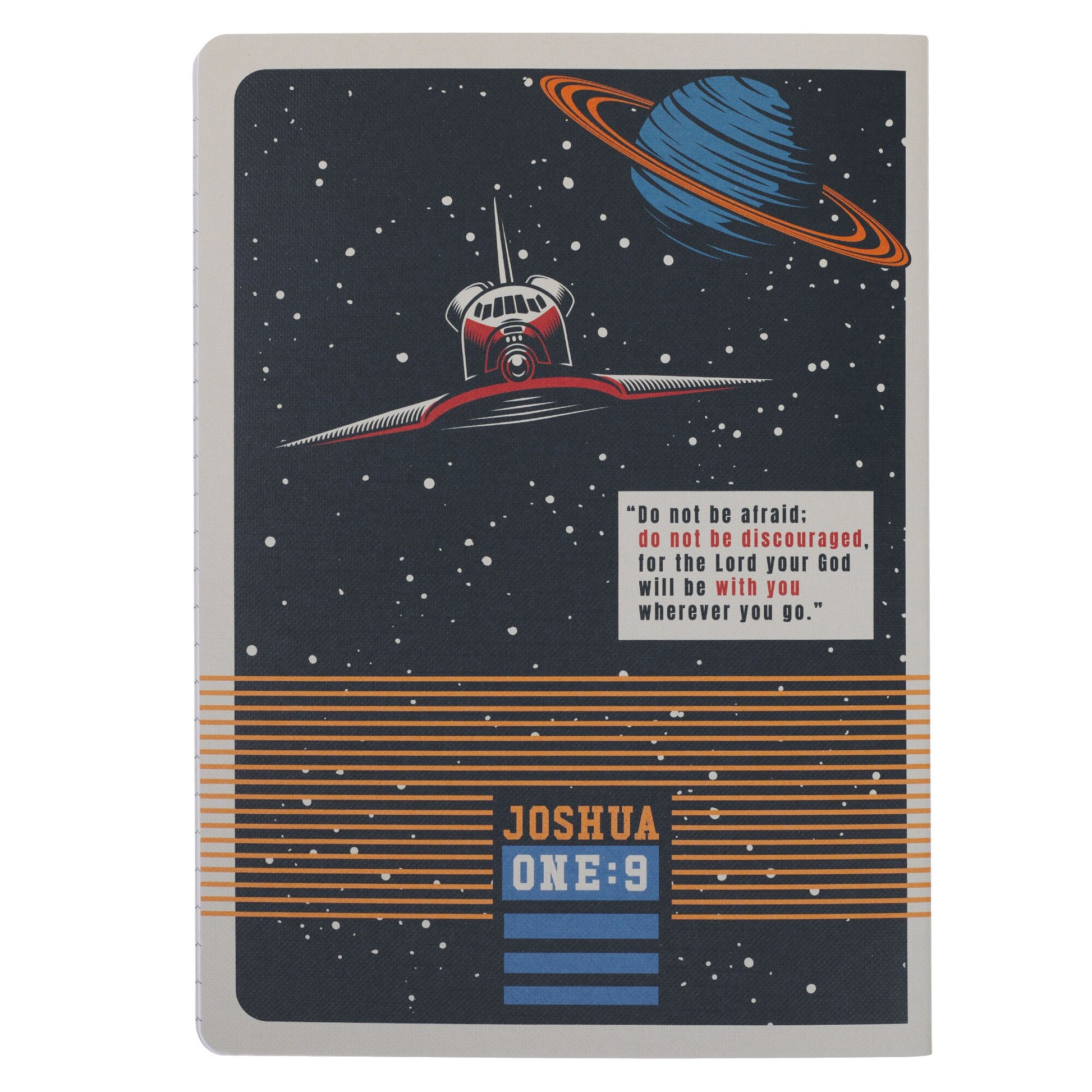 The Be Strong and Courageous Blue Space Notebook is part of the Be Brave Boy Space Collection that includes a fashion Bible cover, a stainless steel water bottle, a second stainless steel water bottle with a set of stickers, a set of lunchbox notes, a gift bag, a 140-piece puzzle, a silicone pencil case, an assorted sticker set, a sticker roll, a retractable pen set, a large notebook, a secret diary, a medium planner pad, a cardstock bookmark set, a magnetic bookmark set, and a premium cardstock bookmark.