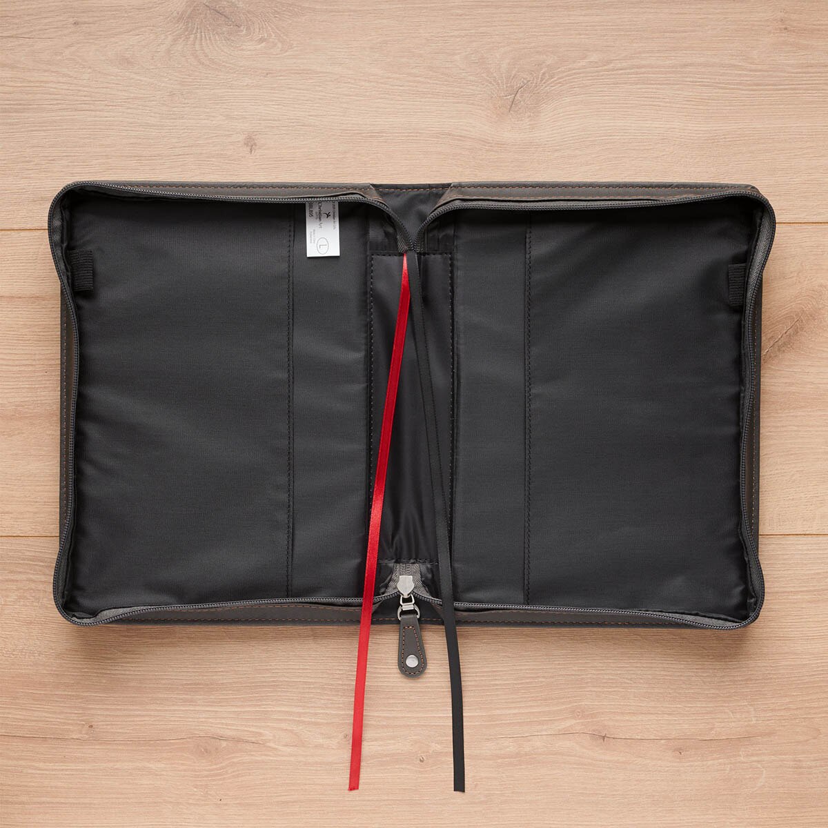 The faux leather Bible case has sturdy topstitching along the edges. A lay-flat handle with silver metal hardware and a gray faux leather zipper pull, paired with a smooth zipper closure, will protect his Bible from scuffs and scratches. Inside, two pen loops give him space to store a pen or highlighter for notes, two satin ribbon markers let him mark multiple passages, and there's plenty of room to slide his favorite study Bible.