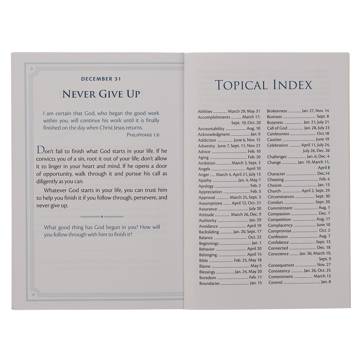 God's promises take center stage in the Be Strong and Steadfast Softcover Daily Devotional. 366 devotions and promises from God's Word will encourage you to trust that He will always do what He promises. Topics range from adversity, compromise, and finishing well to perseverance, stress, and victory. Each devotion includes a Scripture verse, short devotion, and a call to action or inspiring thought for the day. Read the book as a year-long daily devotional (there's even a day for February 29), or use the handy topical index to quickly find a devotion that fits your particular needs for the day.