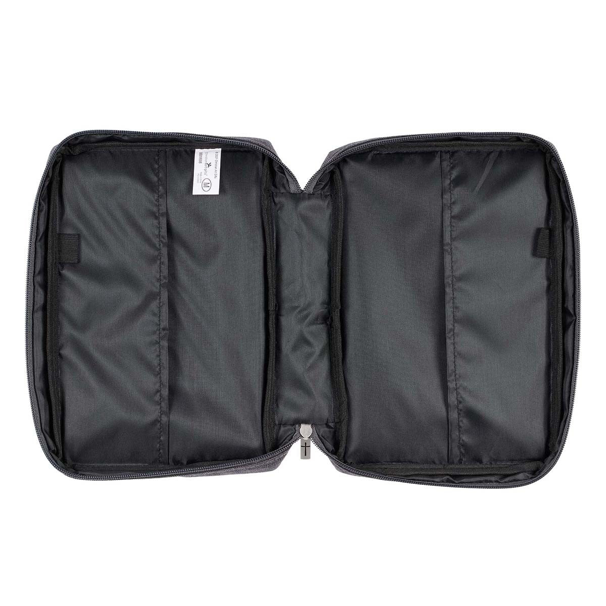 This Bible cover has a lay-flat poly-canvas spine handle that allows it to open completely flat when in use. The sturdy zipper with a cross-engraved brushed silver zipper pull keeps all contents securely inside. An exterior zippered pocket with a cross-engraved brushed silver zipper pull is added to the back panel to store notes, coins, or even facial tissues. Inside are two slip pockets that snuggly hold the Bible's outer covers and two pen loops that allow for easy access to a pen and highlighter.