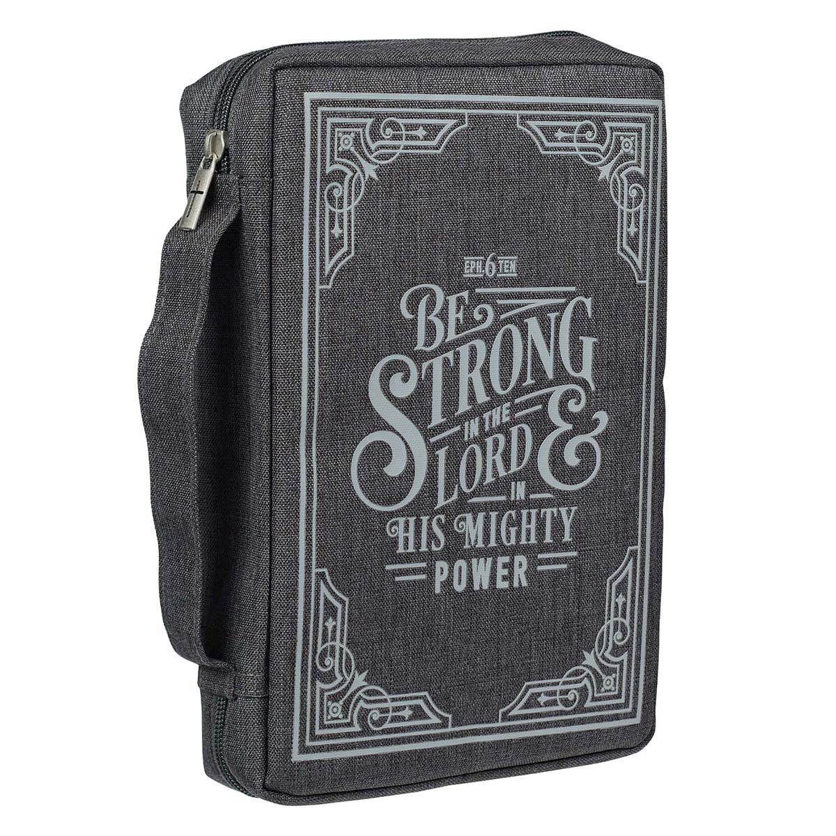 The charcoal gray poly-canvas Bible cover with its durable and water-resistant fabric can stand up to heavy use. It is screen-printed on the front with a light gray frame, embellished with decorative corner scrolls that outline the powerful words from St. Paul's letter to the Ephesians.