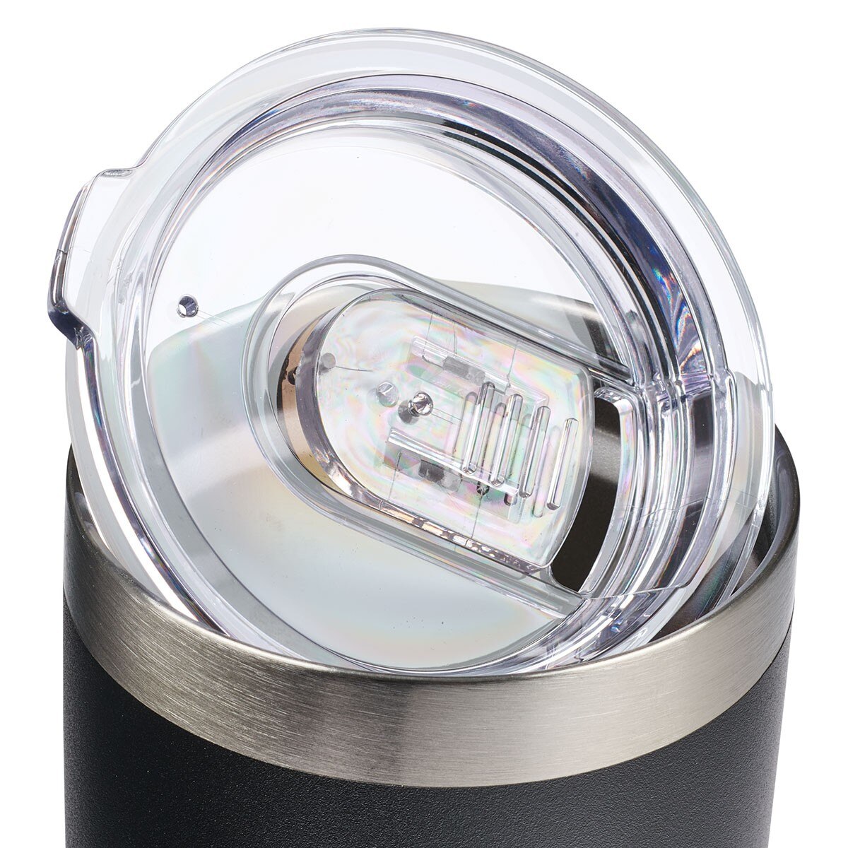 Two smooth stainless steel bands border the matte black exterior and mimic the double-walled interior. The double-insulated walls maintain the temperature of hot or cold beverages for hours, so it is perfect for your commute to work. The insulation also prevents condensation, and this bodes well for all wood surfaces. A clear plastic lid with a silicone ring fits snuggly into the mouth of the mug, and a retractable sip hole cover prevents any spills or leaks.