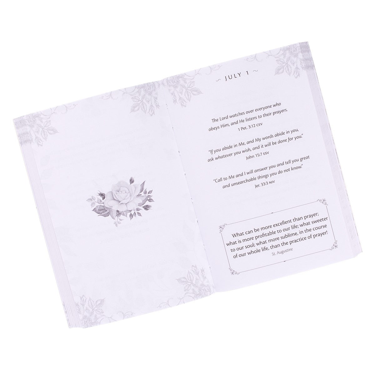 The taupe-colored softcover of the small devotional is decorated with a simple gold-foiled frame with delicate corner scroll designs. A luscious bouquet is spot-varnished and set at the bottom of the frame. The title is presented in thin black block letters accented with gold-foiled scripted letters.