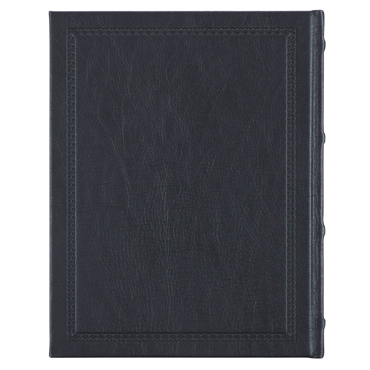 The cover of the Bible is made of black full-grain leather with a simple heat-debossed decorative frame and a gold-foiled title on the front and spine.