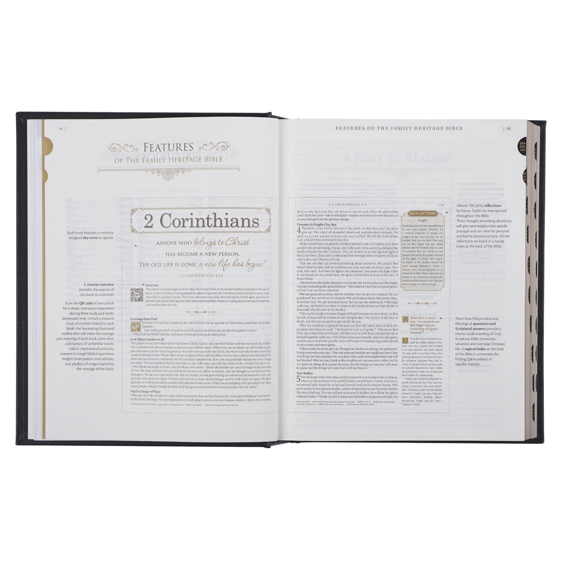 The Bible also includes almost 700 concise reflections by Nancy Taylor, interspersed throughout its pages. These thought-provoking devotions offer new insights into specific passages and are ideal for personal and family devotional time. All the reflections are listed in a handy index at the back of the Bible. Additionally, more than 900 practical and theological questions and Scriptural answers provide a clearer understanding of God, Scripture, Bible characters, salvation, and everyday Christian life. A topical index at the back of the Bible makes it convenient for finding Q&As related to specific matters, and 8 full-color maps are also included.