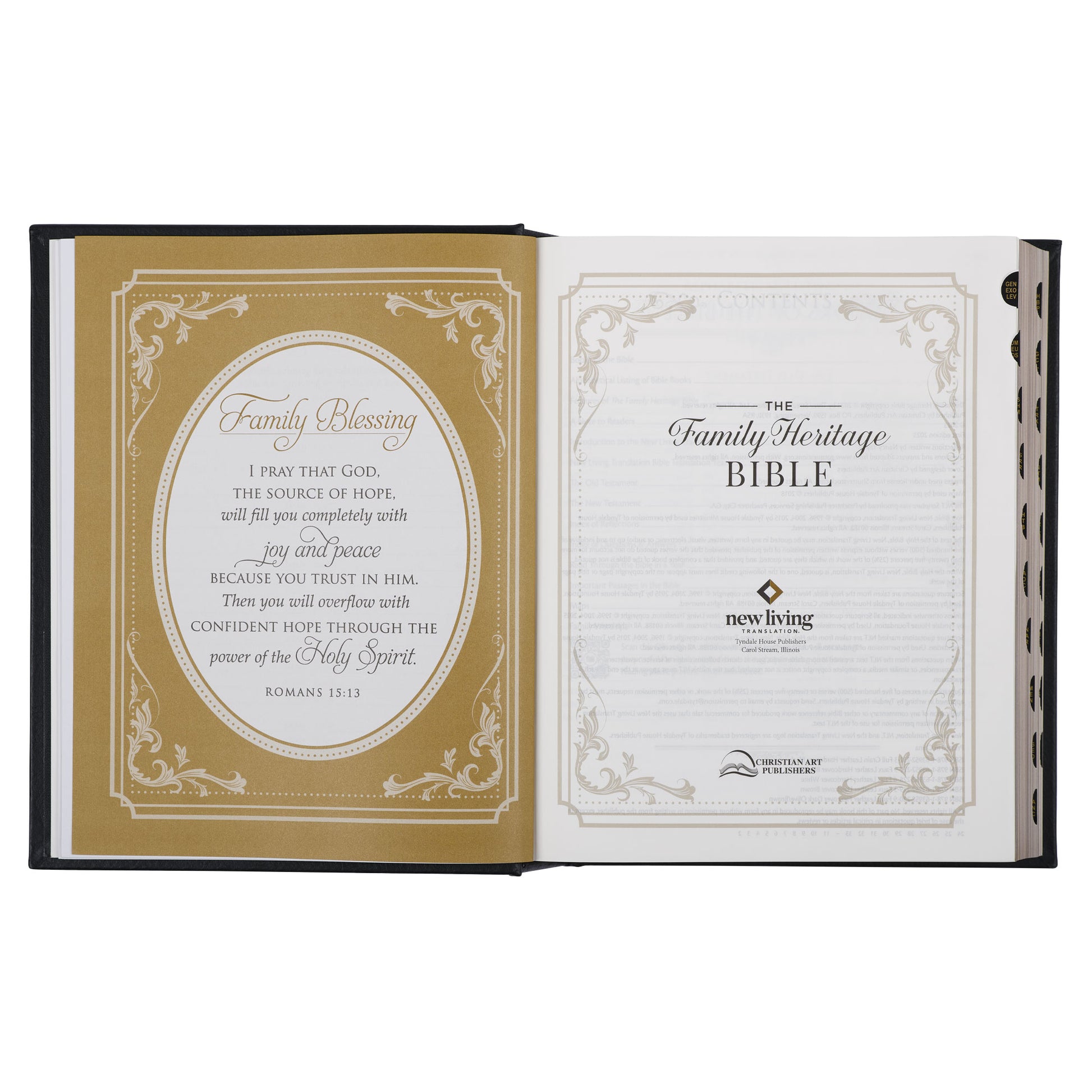 The interactive Family Heritage Bible features the complete text of the New Living Translation® in a generous 12.5-point font size and single-column layout. An introduction at the front of the Bible explains the rationale for translating the NLT and introduces the team that translated it.