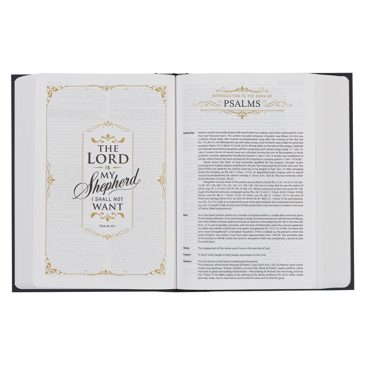 But it's not just the exquisite design that sets this study Bible apart. Its remarkable features will elevate your personal or family Bible study. The pages are meticulously printed with black ink, enhanced by metallic gold decorative accents that add a touch of opulence. Two satin ribbon markers are thoughtfully included to aid your study, allowing you to effortlessly keep track of multiple pages. The text is presented in a clear 9.8-point type, organized in a double-column format, ensuring ease of reading. Thanks to its lay-flat Smyth-sewn binding, the Bible opens seamlessly, safeguarding the spine from damage.