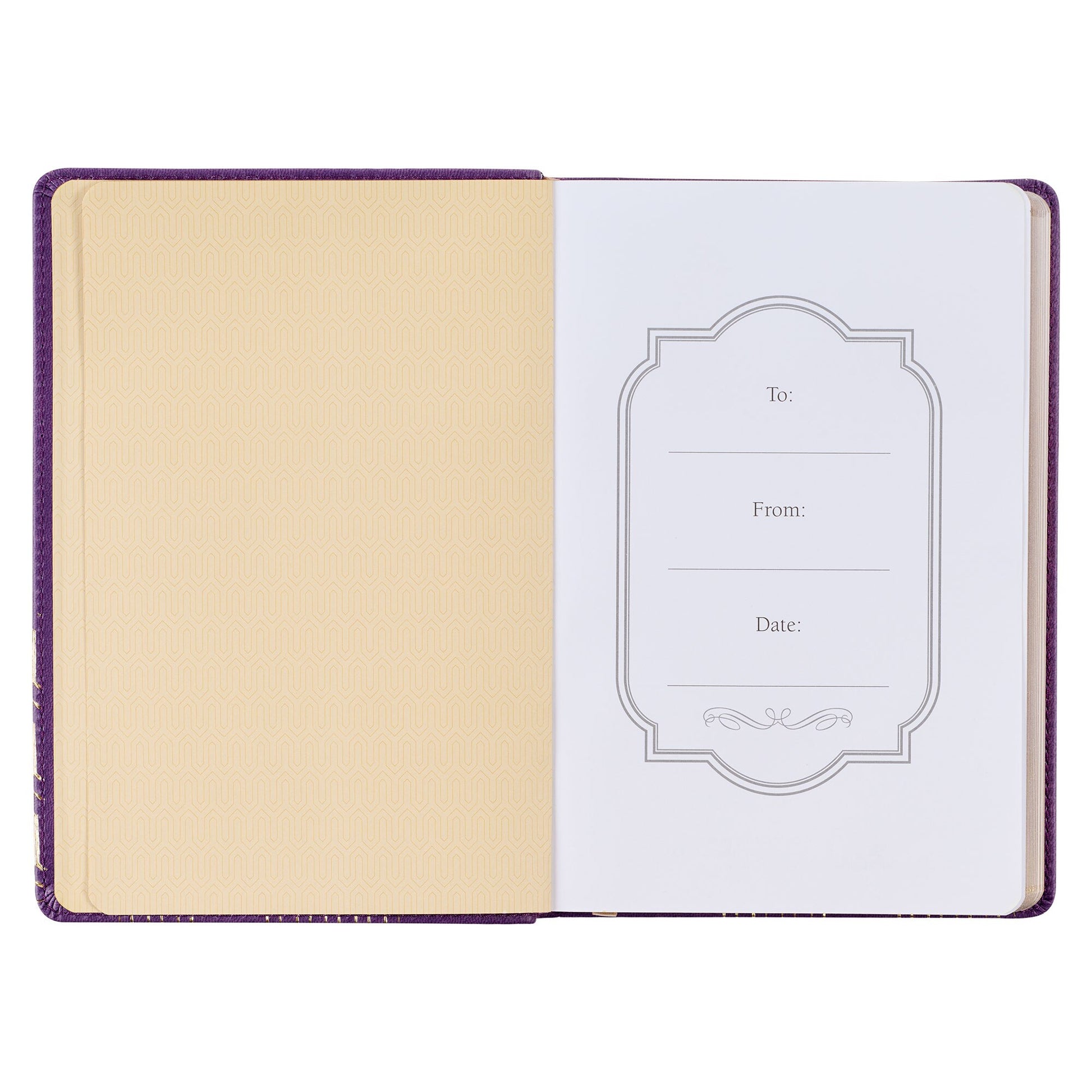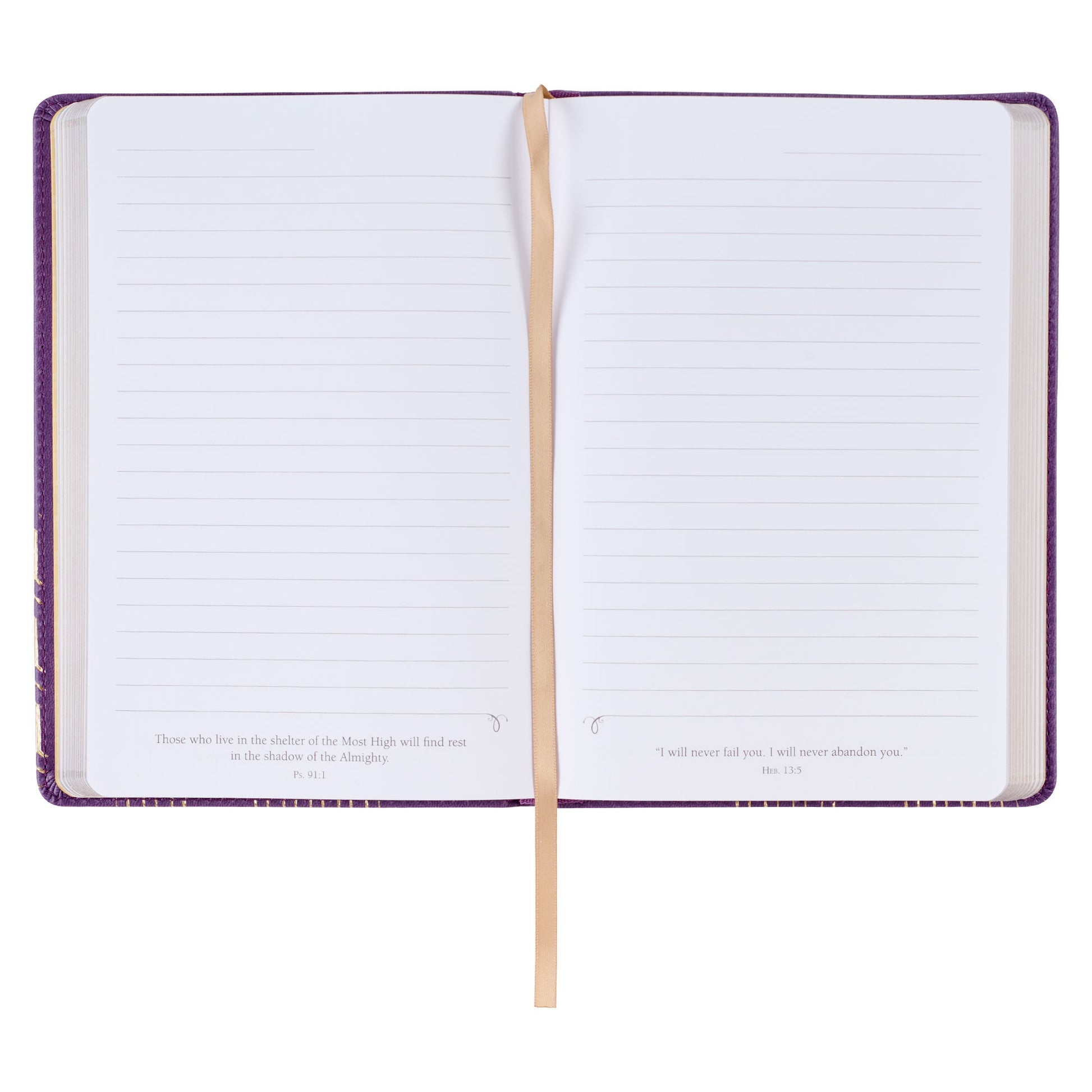 The 336 pages are all creamy white and lined. A Bible verse is printed at the bottom of each page, and a small dotted line in the outer topmost corner can be used for recording dates and content titles. An attached purple satin ribbon is also included to allow for easy place-holding and accessibility.