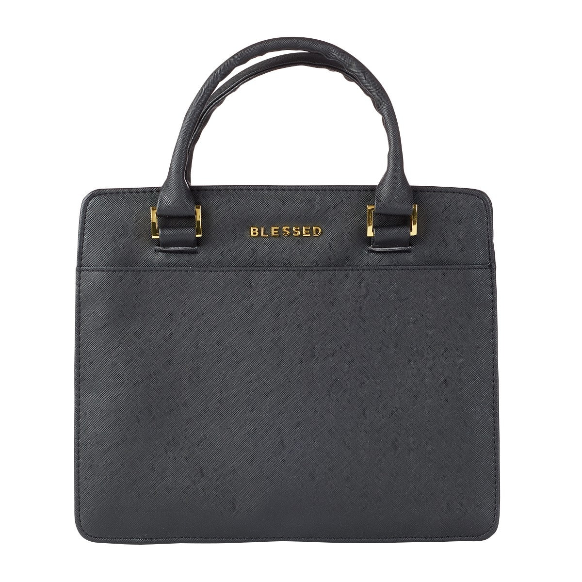 This sleek, fashionable Blessed Black Purse-style Faux Leather Bible Cover will protect your Bible in elegant style.Constructed from luxurious black faux leather, this Bible cover has the look and feel of real leather but for a fraction of a cost! It is made to last and will withstand daily wear and tear while protecting your precious Bible. The black faux leather base is covered with two exterior pockets. On the front panel, nestled between the handles, are gold-colored metal letter studs that spell out the sentiment.