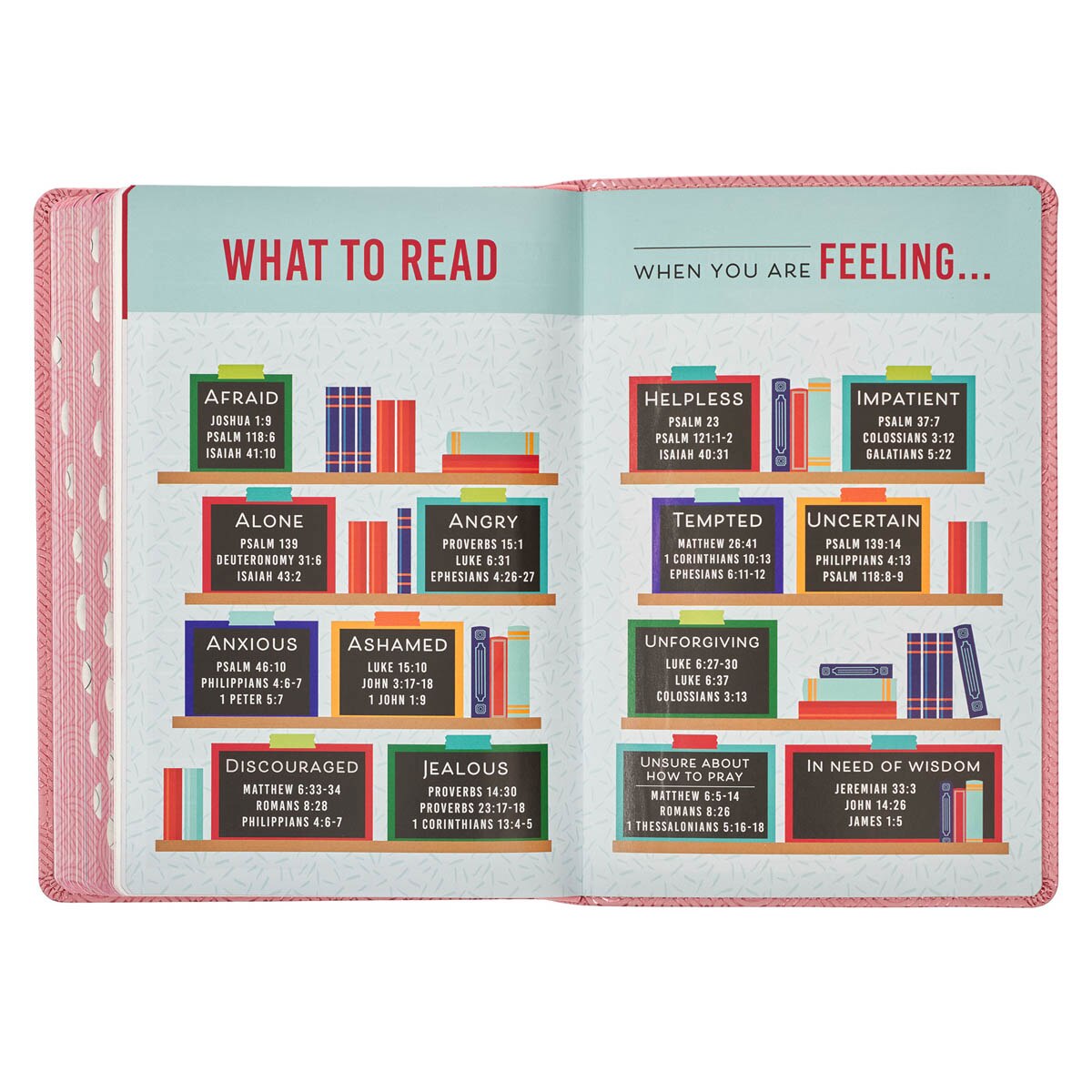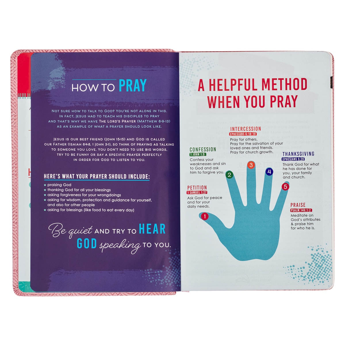 This Bible for girls showcases luxurious features that exude elegance and style. It boasts a pink satin ribbon marker, allowing her to mark her page effortlessly, and pink printed page edges that continue the heart motif and add refinement and charm to the design. In addition, thumb indexing tabs will help her navigate the books of the Bible and speed up finding a specific passage.
