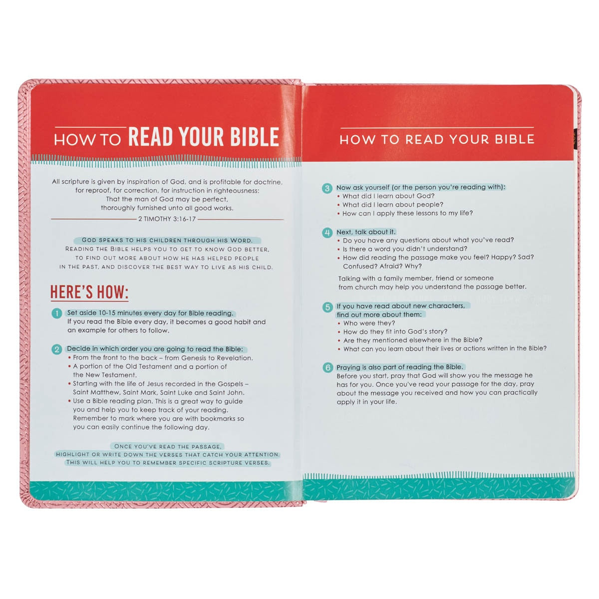 Celebrate your daughter's birthday with the Blossom Pink Heart Faux Leather Kid's King James Version Bible—a gift that will nurture independent Bible study and deepen her connection with God's Word. This enchanting Bible will capture a girl's imagination with its vibrant feature pages bursting with a kaleidoscope of colors. As she delves into its content, she will find interesting facts and explanations that bring the text to life.