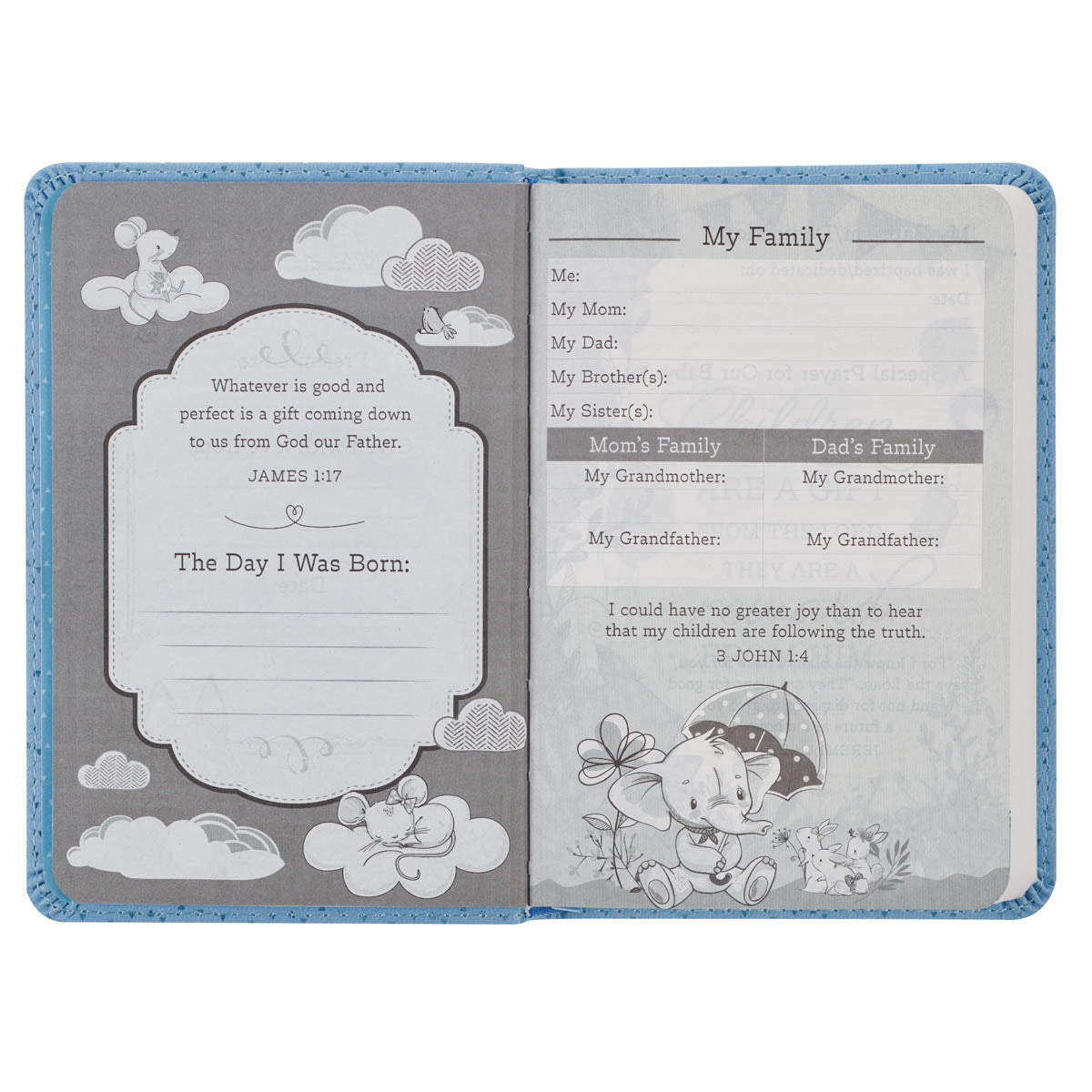 The Blue Faux Leather NLT New Testament Keepsake Bible for Boys comes with space for personalization and family memories. It includes a special page at the beginning for a personalized message, plus additional pages to record milestone moments like the baby's birth, baptism, or christening, along with a family tree. To support and uplift parents, a unique prayer is also included. The Bible is packaged in a two-piece gif box, making gift-wrapping a breeze.