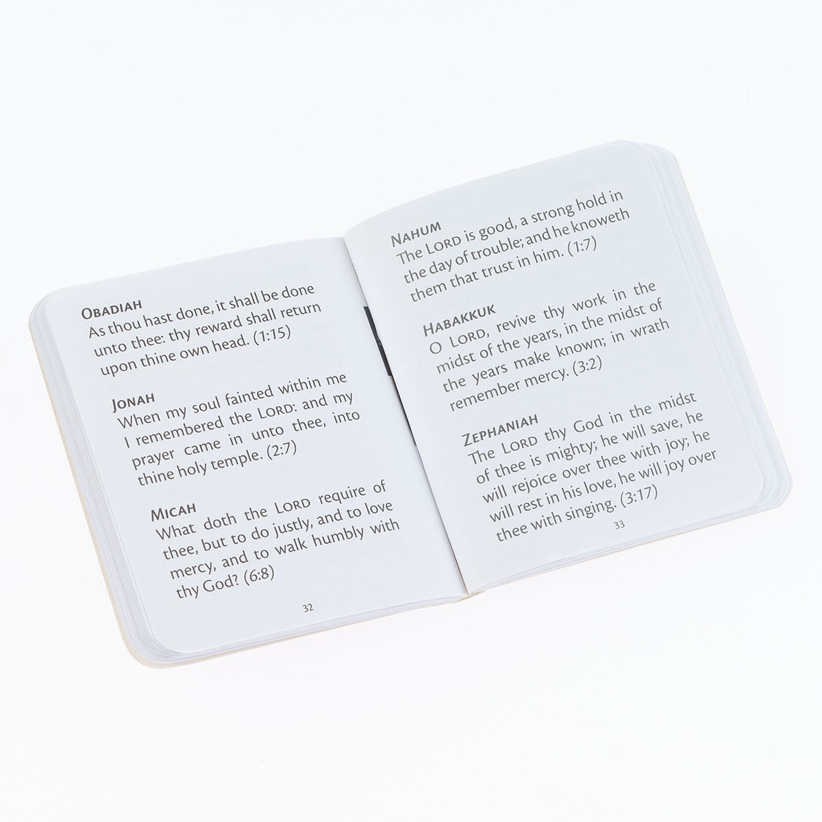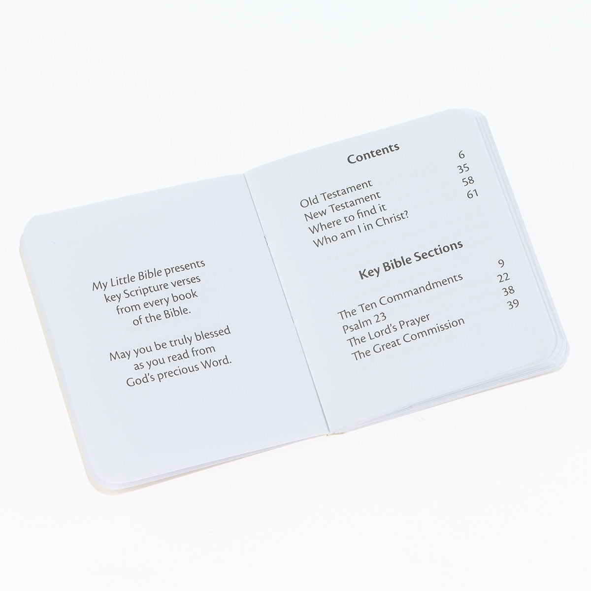 The small booklet that measures roughly 2 by 2 contains key verses from every book of the Bible. It's definitely not the whole Bible, but rather the Bible in a nutshell. Key verses from the Old and New Testaments are followed by a thematic Scripture finder index that helps you find verses about specific topics. The book ends with a section explaining who you are in Christ.