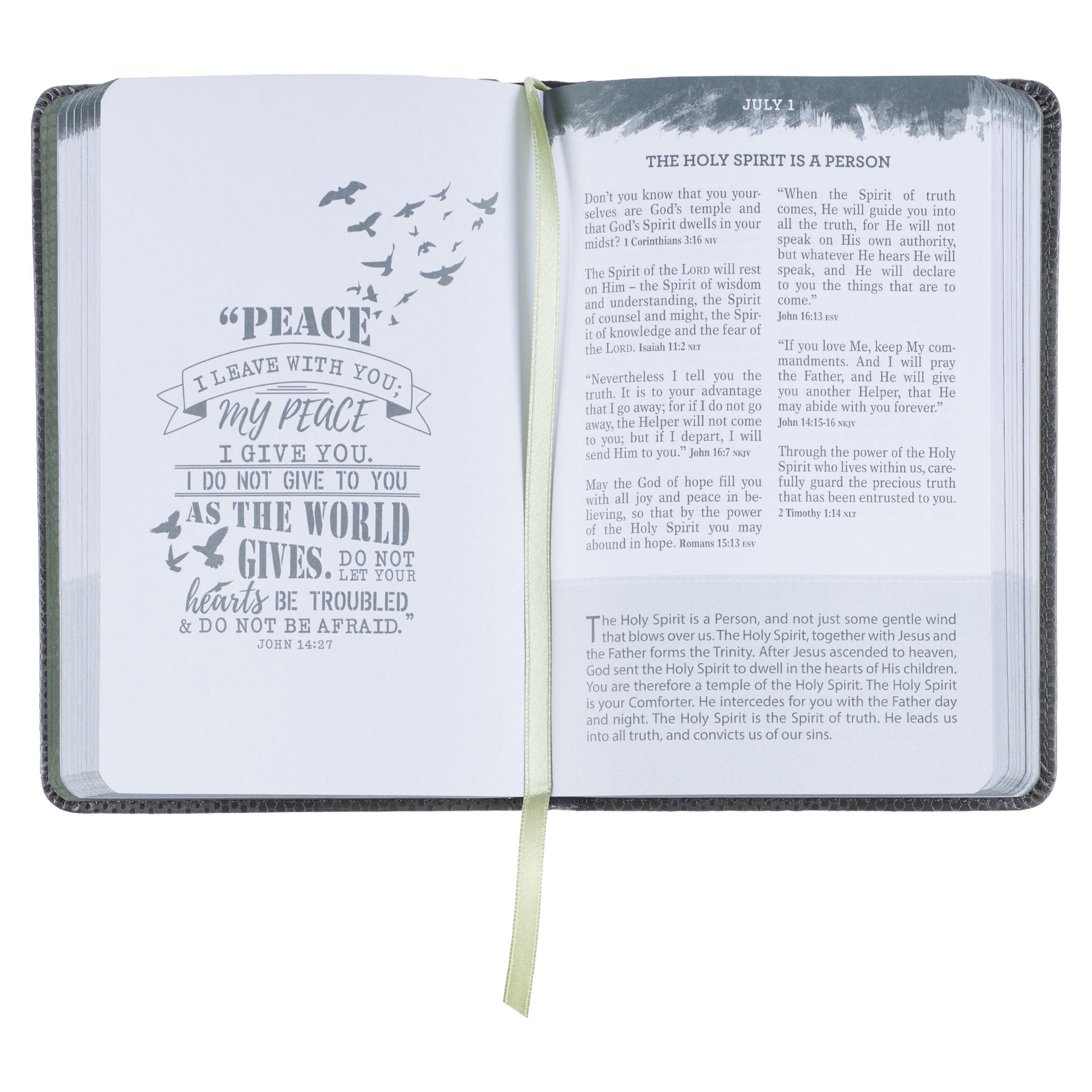 The interior pages are printed in charcoal gray, and a green satin ribbon marker that matches the green endsheets is included to log your progress through the devotional. Gilded page edges add an understated shimmer to the design.