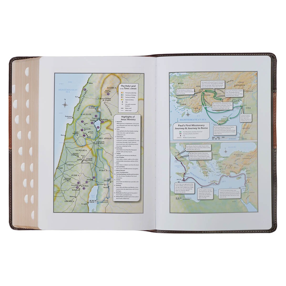 The study Bible's two-tone faux leather cover combines rich burgundy and bright toffee-colored faux leather to create a striking contrast that highlights its classic design. Shiny gold topstitched seams secure the panels and edges of the Bible. The gold-foiled title is centered on the toffee-colored band on the front cover.