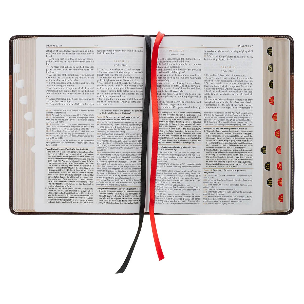The Burgundy and Toffee Faux Leather King James Study Bible with Thumb Index comes packaged in a gift-ready box and makes a meaningful present for Father's Day, a pastor's appreciation, or a graduation gift for a student entering adulthood.