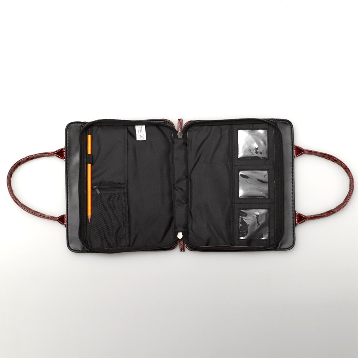 The two-way zipper pulls are constructed from the same croc-embossed faux leather as the cover.The inside of the case features 3 clear pockets that can be used for photos, a zippered mesh pocket, and a pen loop. The cover opens up to lay completely flat.