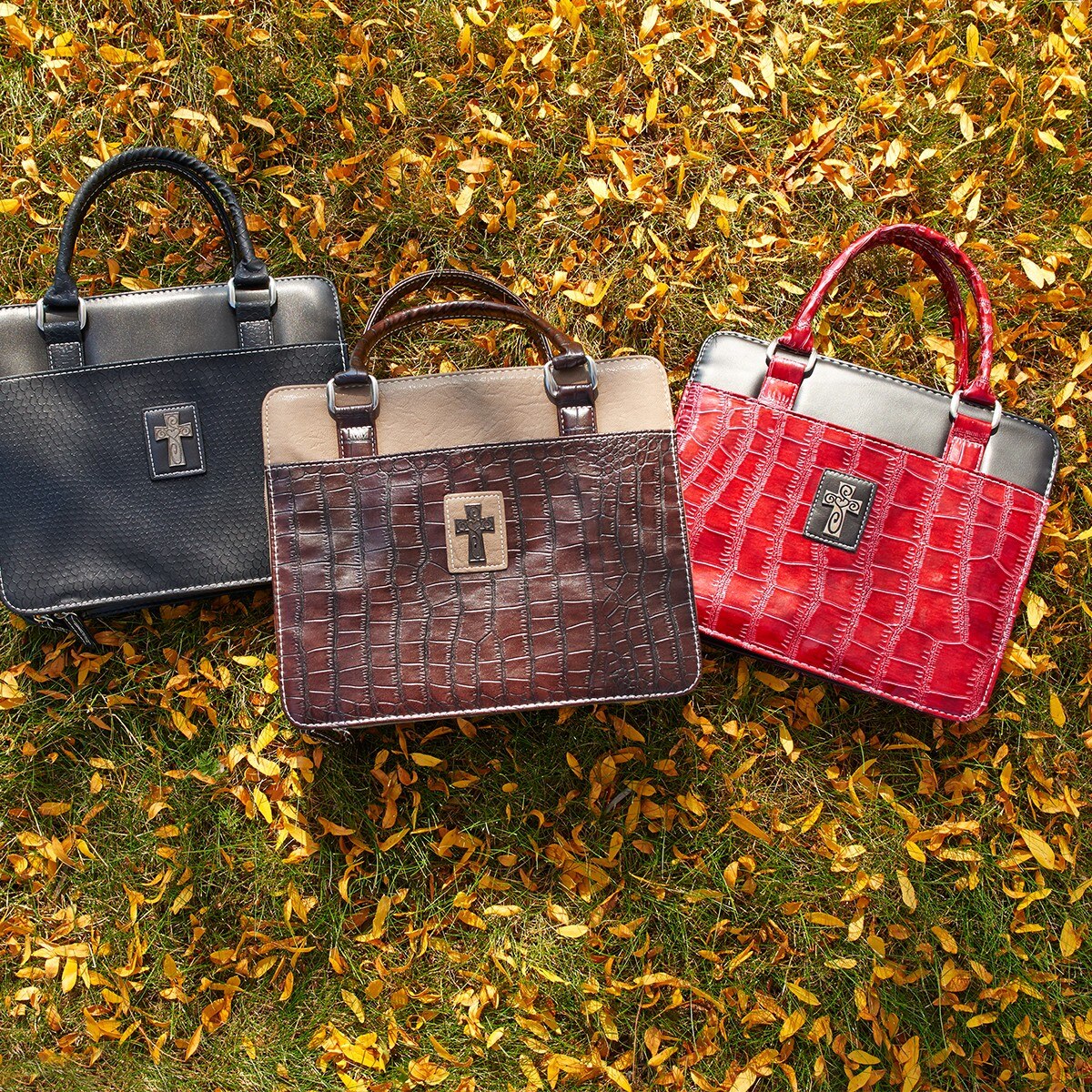 The Bible cover is designed to look like a handbag with its two handles that make it easy to carry your Bible in your hand or on your arm. The croc-embossed texture on this Bible cover looks like patent leather. The stylish design is accented by silver handle hardware and a silver cross on an appliqued patch. Slip pockets can be found on the front and back panels.