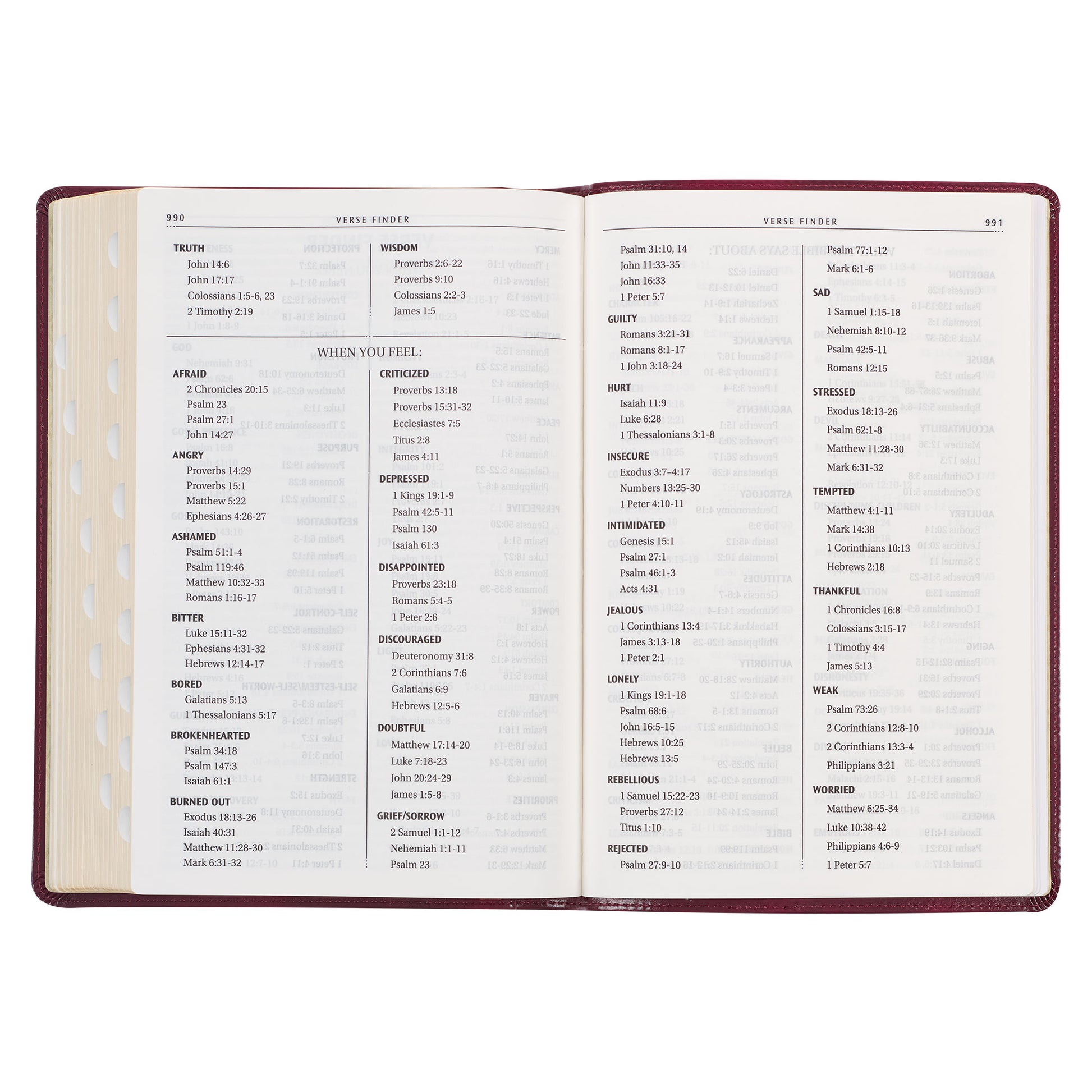 Whether you are looking for a Bible for a young or elderly reader, the Burgundy Cross Faux Leather Large Print Thinline King James Version Bible with Thumb Index, with its lightweight binding and larger text, is the perfect find.