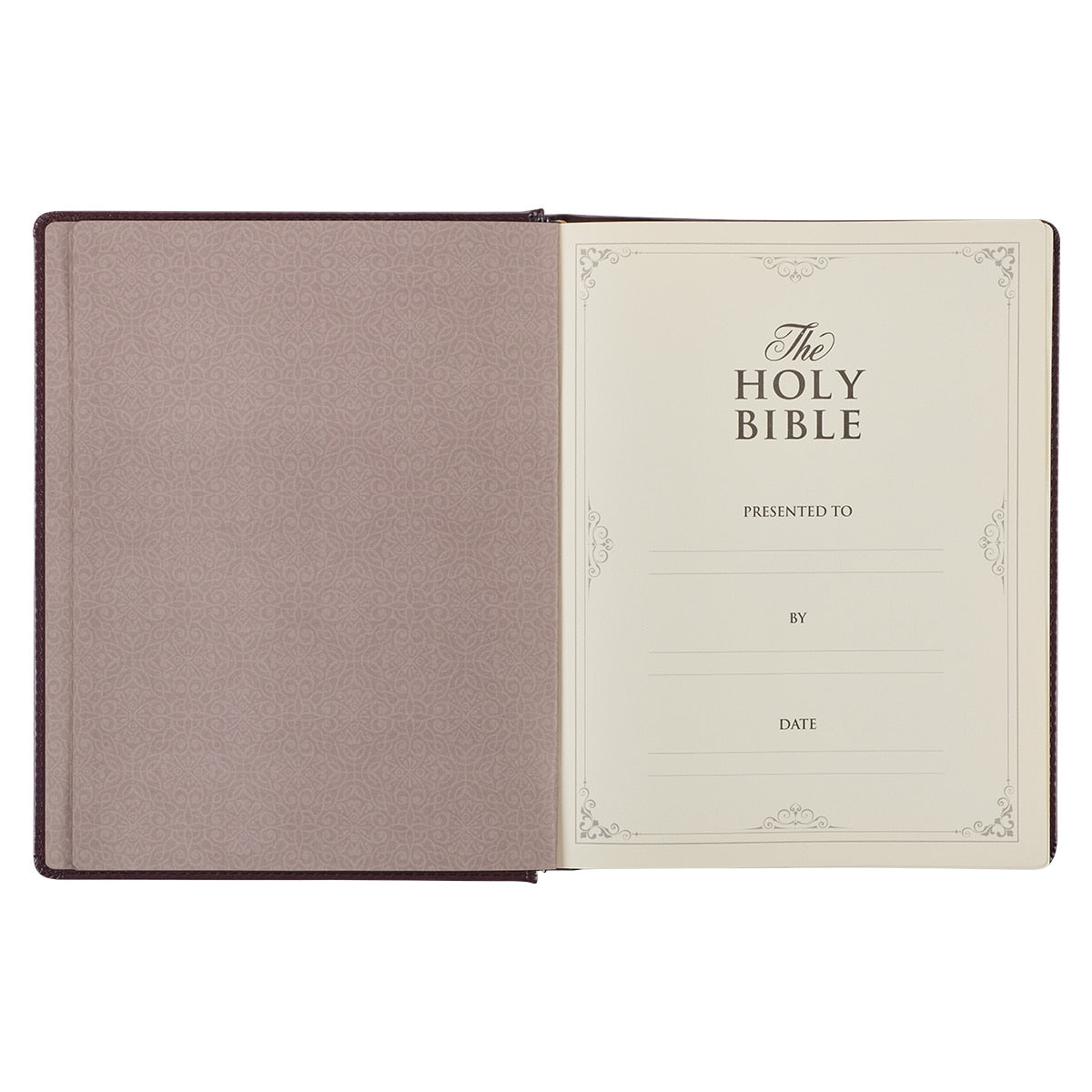This hardcover journaling Bible is wrapped in smooth burgundy faux leather. The covers are decorated with a simple heat-debossed frame with fleur-de-lis corner accents. The frame is filled with an argyle-styled diamond design. The gold-foiled title, version reference, and imprint appear only on the spine, with the title accented by a heat-debossed background.