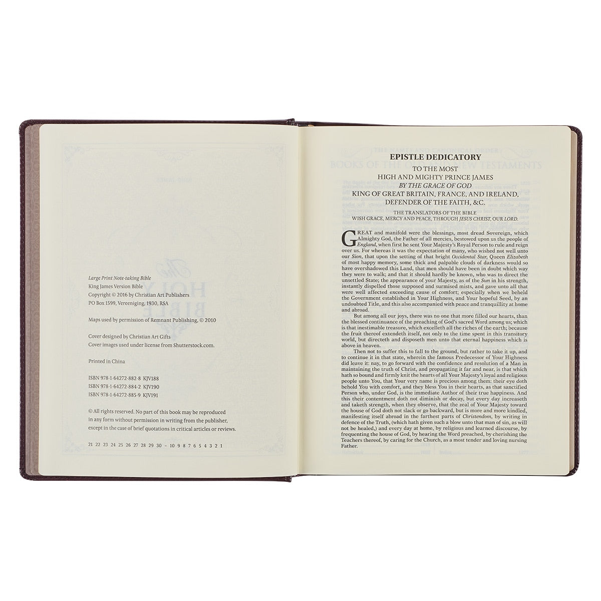 The 10.8-point type ensures the printing is readable without strain, and the 2.5-inch wide margins features 1.8-inch lines that let you take notes while studying the Word. The entire KJV Bible is presented in the original 1769 English text with added reader-friendly subheadings. Additional study helps are also available in this Bible and include two satin ribbon markers, a thematic Scripture verse finder, a concordance, a one-year Bible reading plan, and 8 full-color maps. The Epistle Dedicatory to the original KJV Bible is included for historical reference and several pages are included in the back for your own notes. The Bible is packaged in a full-color printed cardstock sleeve.