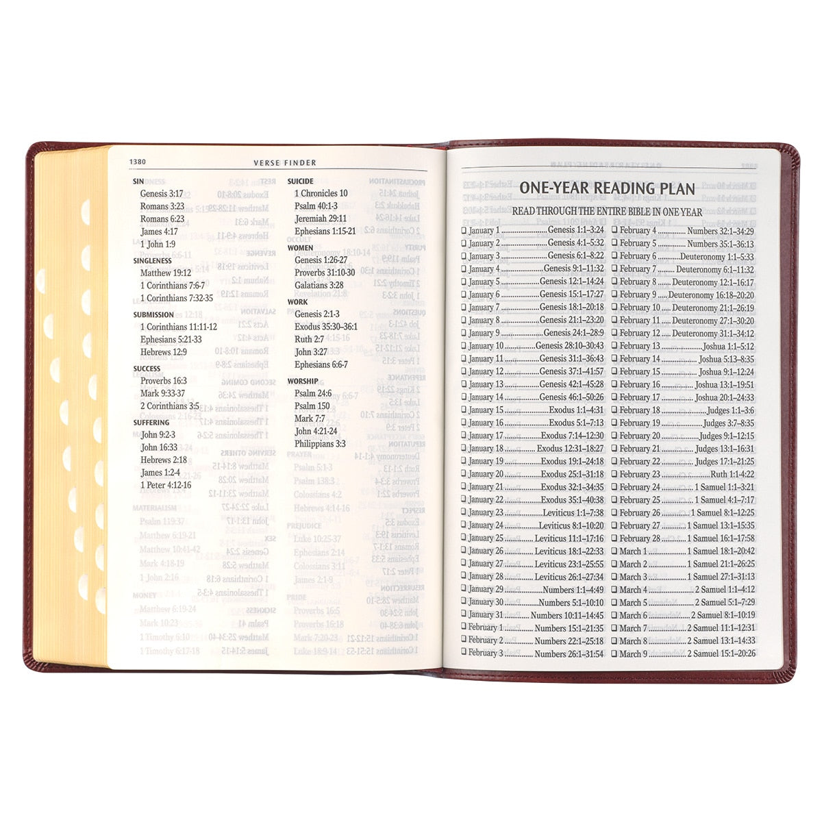 A one-year Bible reading plan is included in the back of the Bible if you wish to structure your Bible reading in such a way to read through the Bible in a year. The Bible is packaged in a full-color printed cardstock sleeve.