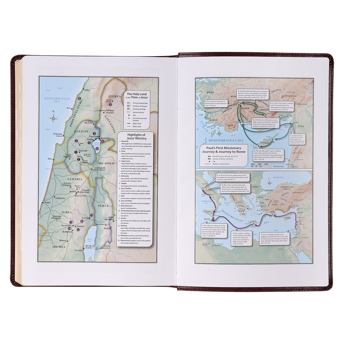 The full-size Bible is slightly larger than a standard Bible to accommodate the easy-to-read 14 point type. Essential study resources include double-column formatting, a thematic Scripture verse finder, 8 full-color maps and the words of Christ that are printed in red ink. The original 1769 English text is used for this Bible with the addition of reader-friendly subheadings. The reader should anticipate subtle variations in spelling and language usage that will differ from modern English.