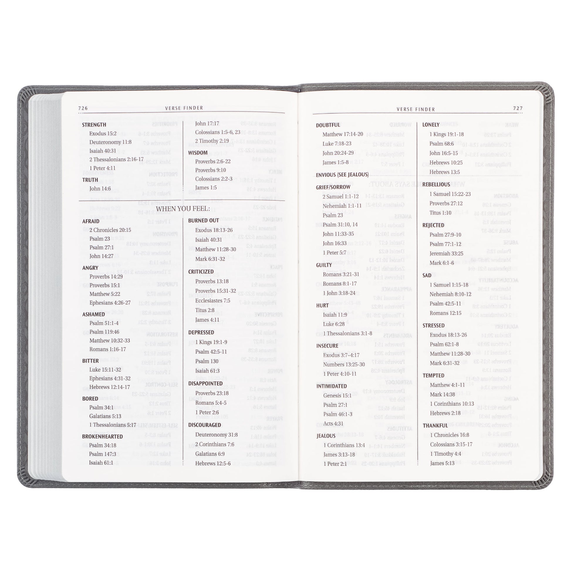 Charcoal gray topstitching supports the edges of this handsome Bible. The heat-debossed title is repeated on the spine and flanked by two sets of heat-debossed faux spine ribs. Silver-sprayed page edges add a subtle sheen to the regal design.