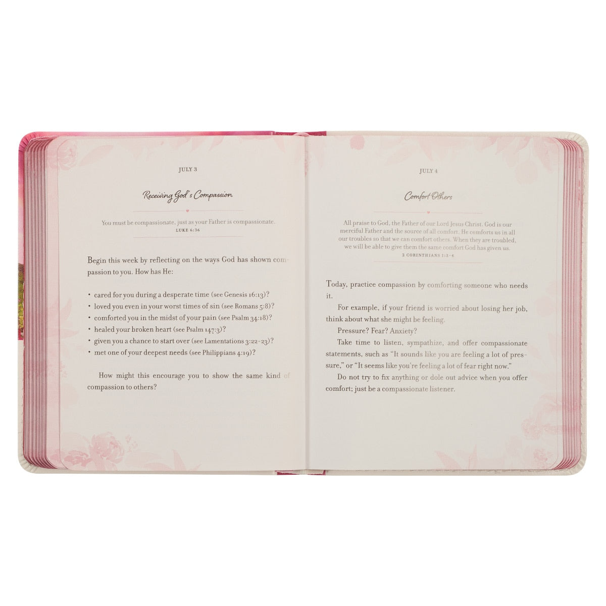 The Daily Habits of the Heart One Minute Devotional will help develop spiritual practices to draw you into a more profound and lasting relationship with God.This devotional's smooth faux leather cover is decorated with a serene landscape that showcases a heart-shaped tree filled with fluttering pink foiled leaves. The title is presented in large black letters accented in pink foil.