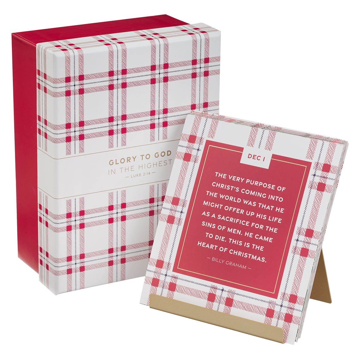The Desktop Advent Calendar is part of the Merry Christmas Plaid Collection. This extensive collection includes a gift ag set, a ceramic ornament, an advent calendar, a paper napkin set, a ceramic mug set, a ceramic plate set, a ceramic coaster set, a decorative wreath, and a gift bag.