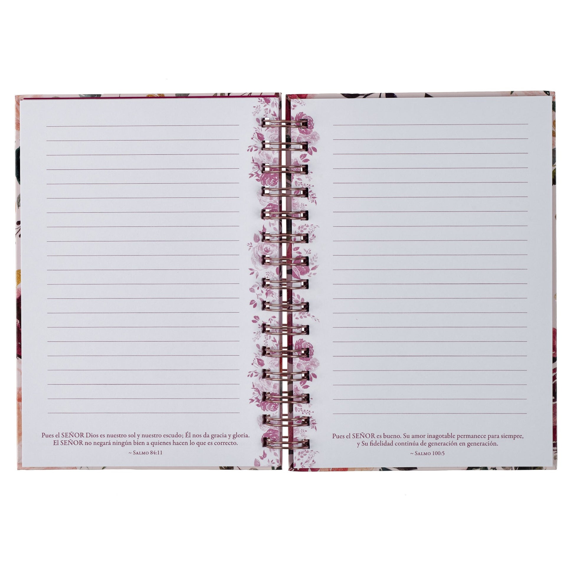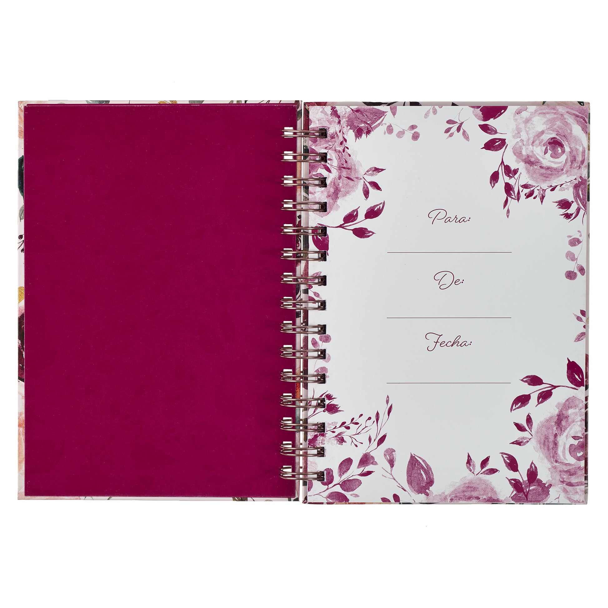 La cubierta rosa claro del diario anillado de alambre contiene un conjunto de ilustraciones florales de color ciruela y rosa pálido que rodean el texto bíblico. El mensaje está escrito en dos tipos de letra y se presenta en dos colores: gris y ciruela brillante.