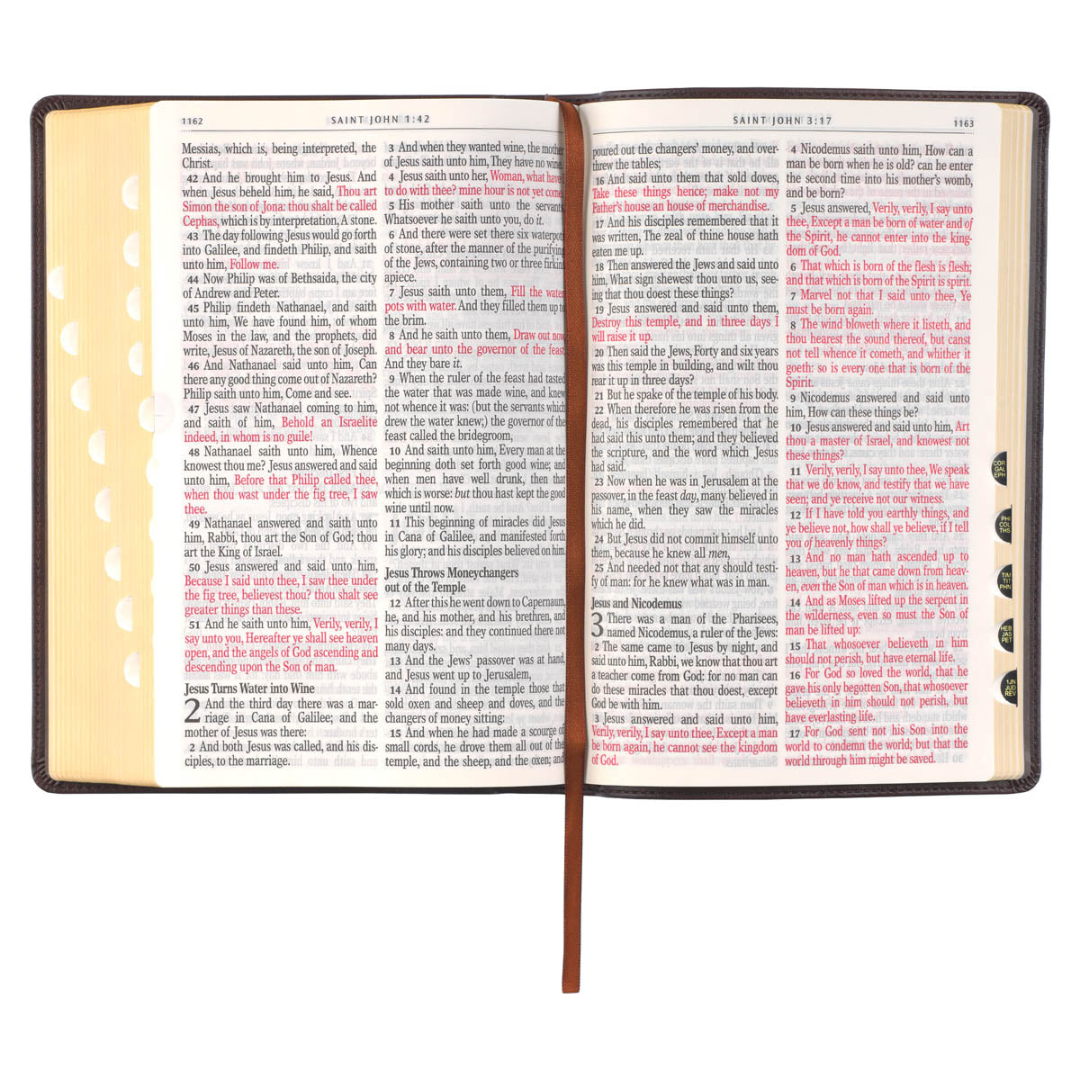 Topstitching along the edges of the faux leather Bible adds strength and durability. The flexcover Bible with its Smyth-sewn binding opens completely flat without damaging the spine. Black thumb-indexing tabs offer an easy way to navigate your Bible, and the dark brown satin ribbon will keep your place once you find it. Gilt-edged pages add a little luxury to an understated design.