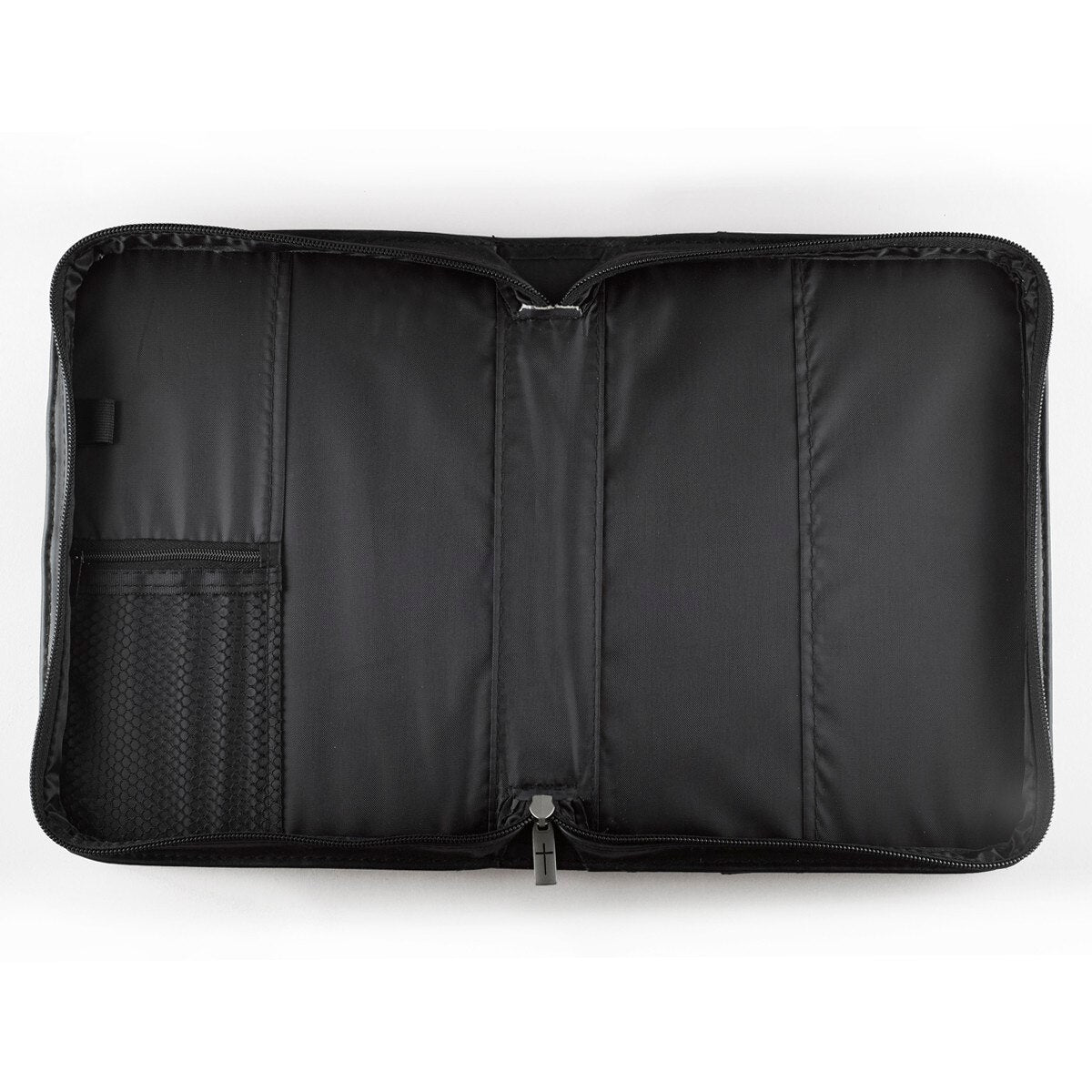 The back cover holds an external slip pocket. Suitcase style carrying handles are secured with silver hardware that matches the cross engraved silver zipper pull. Inside you will find a zipped mesh pocket and pen loop.
