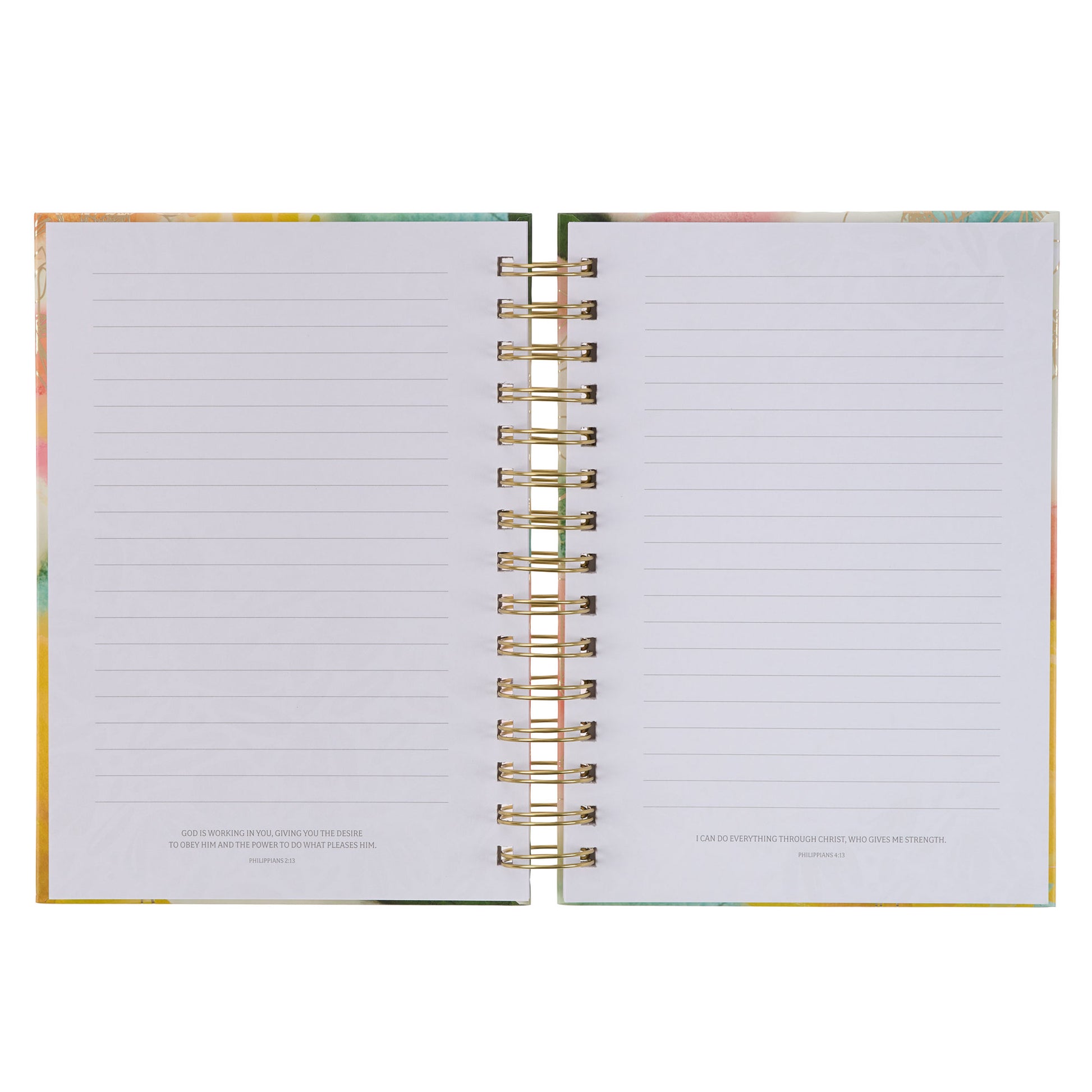 192 creamy white, lined pages are bound with a gold-toned wire binding. Each page has a unique Bible verse placed at its foot for special, daily encouragement from God's Word. The wire binding makes it easy to flip over the hardcovers to use as support for writing.