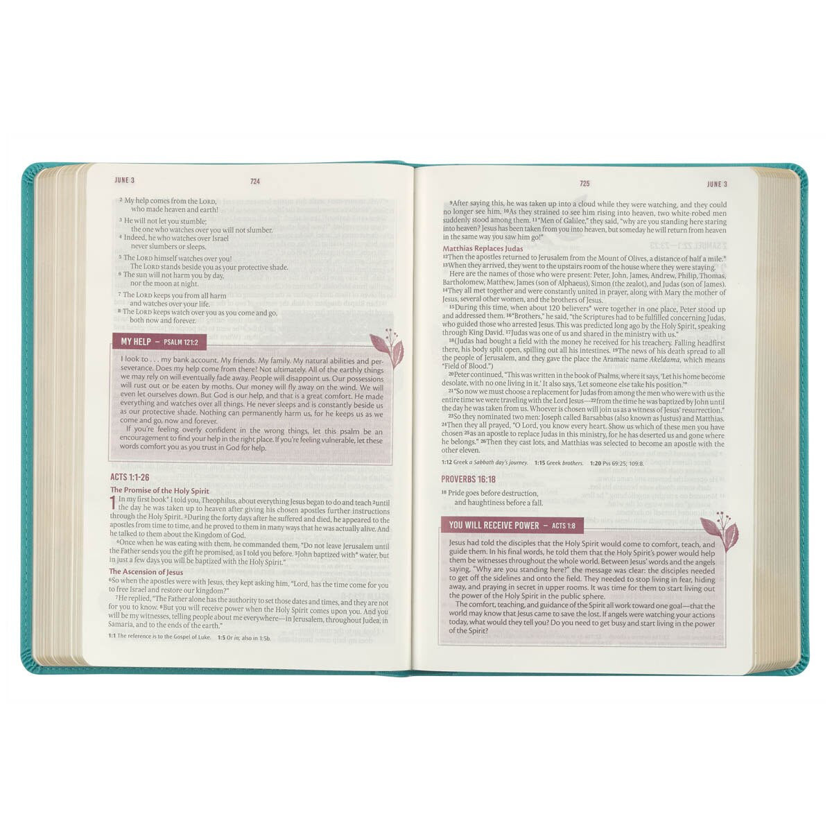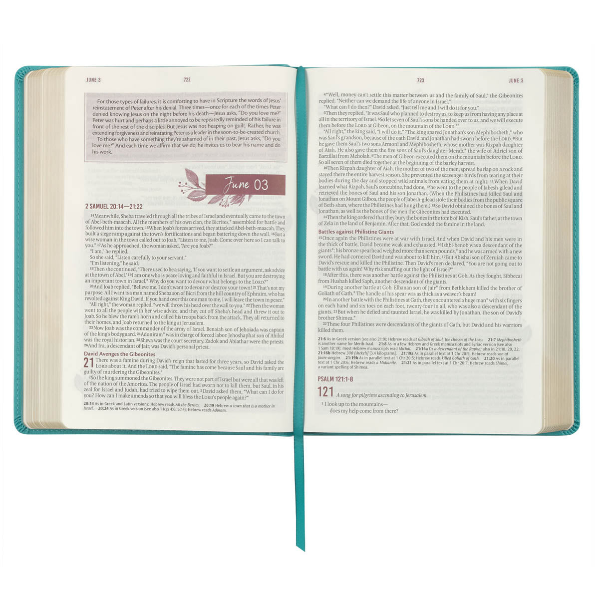 Dedicate your time to read through the Floral Teal Faux Leather NLT Everyday Devotional Bible in a year and reap the benefits of cultivating an intimate relationship with God. Drawing near to God will put you in the proper posture to grow your faith and solidify what you believe.