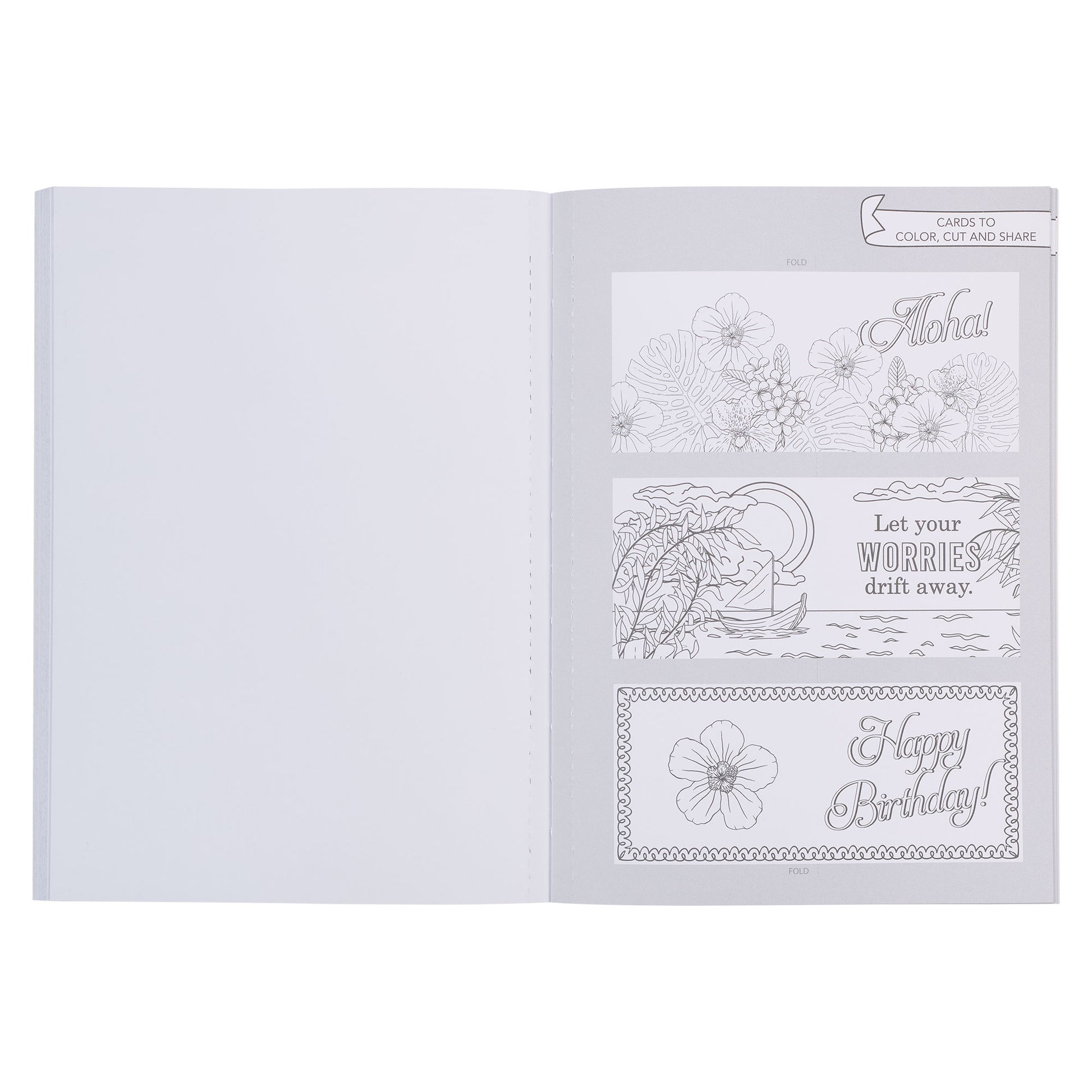 The coloring book features a softcover binding with a tranquil sand-colored cover design, beautifully adorned with vibrant tropical flowers and delicate seashells. UV varnish adds a delightful gloss to the vibrant colors. The embossed title is presented in orange and white letters and outlined in teal.