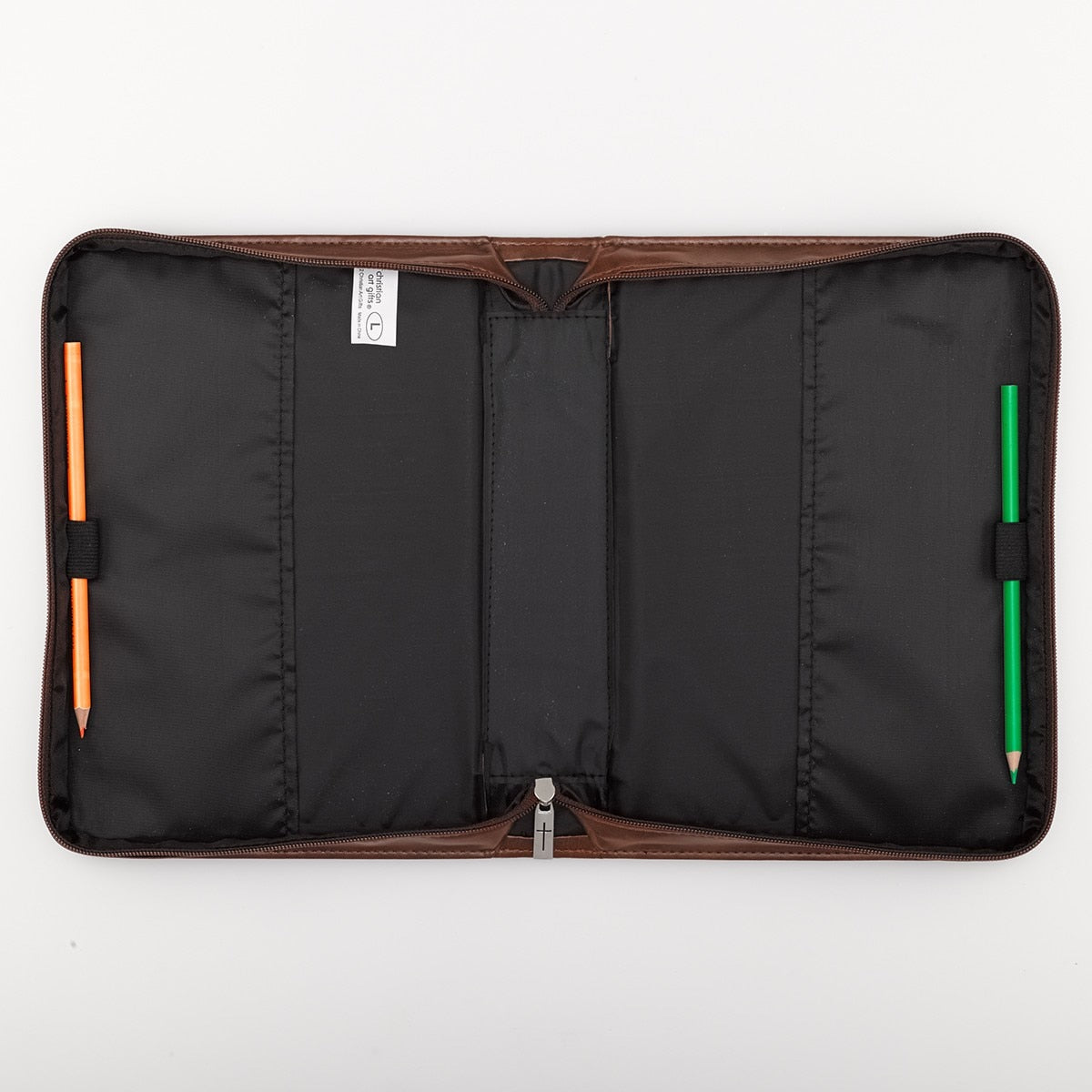 The back cover features a full-full-length slip pocket in the lighter tan color, and the three crosses are heat-debossed in the lower left corner. There is an exterior zipper with a silver cross-engraved zipper pull, a convenient lay-flat spine handle, and 2 pen loops inside the Bible case.